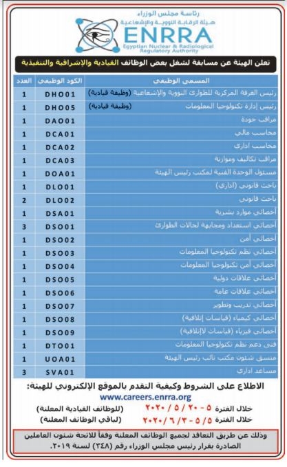 أعلنت هيئة الرقابة النووية والاشعاعية عن مسابقة جديدة تتضمن الالتحاق للعمل بها وفقا لشروط محددة :_