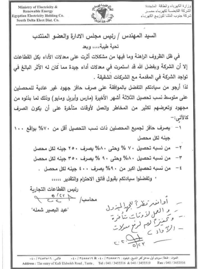 وافق المهندس محمد عبد الحكم رئيس مجلس ادارة جنوب الدلتا لتوزيع الكهرباء على صرف حافز جهود غير عاديه لجميع المحصلين بالشركة تقديرا للجهد المبذول والعمل لأوقات متأخرة وتحفيزا لهم لرفع معدلات الأداء وزيادة نسب التحصيل بالشركة فى ظل الظروف الاستثنائية التي تمر بها البلاد ، بسبب فيروس كورونا المستجد.