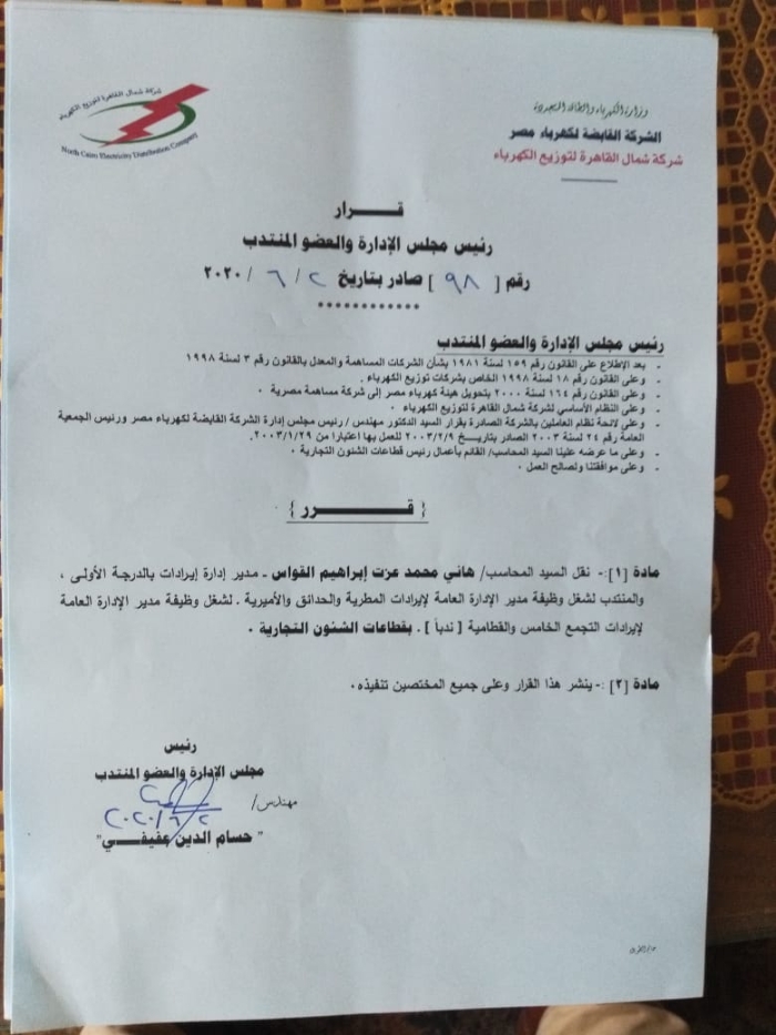 اعتمد المهندس حسام الدين عفيفى رئيس شركة شمال القاهرة لتوزيع الكهرباء أكبر حركة ترقيات وتنقلات بقطاعات الشئون التجارية والشبكات بالشركة وذلك بهدف ضخ دماء جديدة ،حيث شملت الحركة منح كوادر شبابية الفرصة فى إثبات ذاتها إيمانا من رئيس الشركة بأهمية الدفع بعناصر شبابية فى المناصب القيادية خاصة بقطاعات الشئون التجارية والشئون الفنية والنظم والمتابعة.