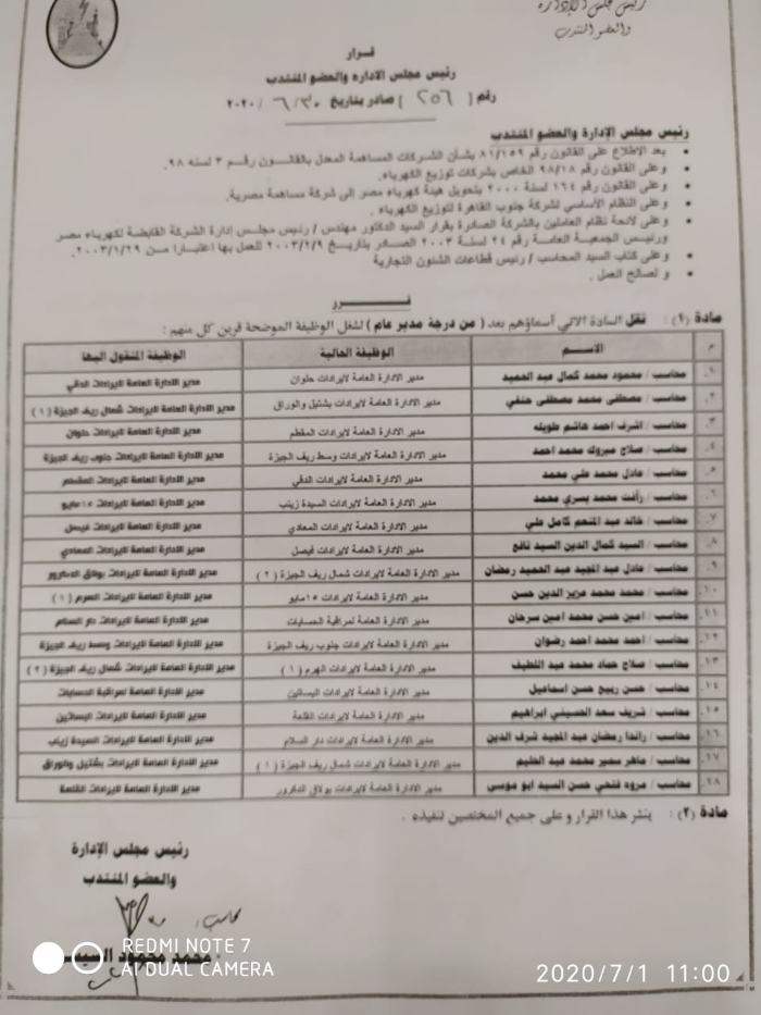 وتضمنت الحركة احتفاظ الثلاثى هانى صبرى رئيس قطاع وسط وغرب القاهرة التجارى بمنصبه وكذلك محمد راغب رئيس القطاع المركزى بمنصبه واحتفاظ المحاسب خالد شقوير بمنصبه رئيسا لقطاع كبار المشتركين بالشركة.