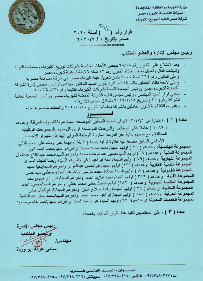 اعتمد المهندس سامى أبو وردة رئيس شركة مصر العليا لتوزيع الكهرباء حركة ترقيات العاملين بمختلف قطاعات وإدارات الشركة للدرجات العليا المختلفة و كذلك ،ايضا، اعتماد قرار تعيين المتعاقدين بنظام المكافأة الشاملة.