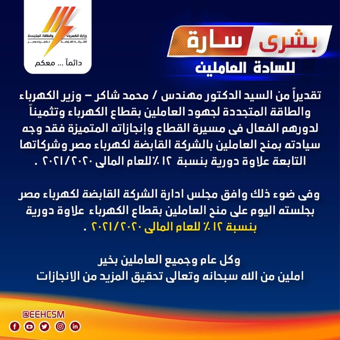 وافق مجلس إدارة الشركة القابضة لكهرباء مصر على منح العاملين بمختلف شركات القطاع علاوة ١٢٪ وذلك تقديرا على مجهوداتهم التى بذلوها على مدار الفترة الماضية .