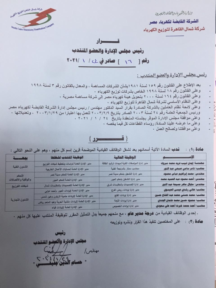 أصدر المهندس حسام الدين عفيفى رئيس شركة شمال القاهرة لتوزيع الكهرباء حركة تغييرات وتنقلات بقطاعات الشئون التجارية شملت عدد من القيادات بهدف العمل على النهوض بالإيرادات العامة التابعة للشئون التجارية مما يعود بالنفع على سير العمل فى مختلف المناطق التابعة للشركة