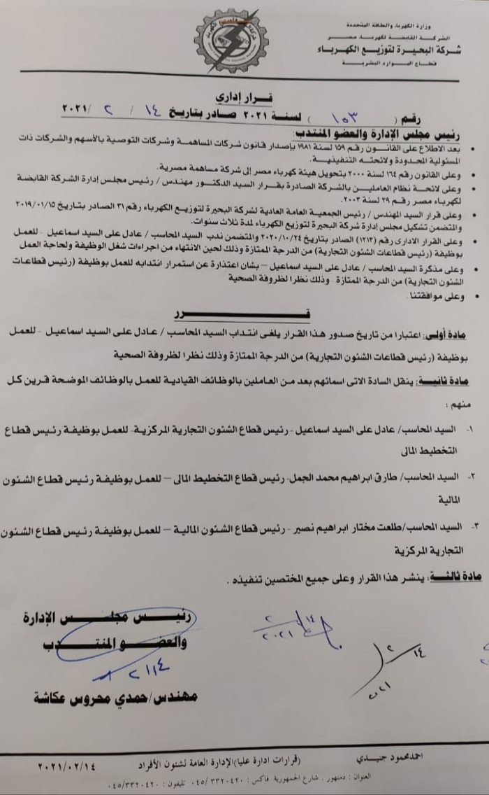 حصل رئيس تحرير عالم الطاقة على عدد من القرارات التى اتخذها رئيس شركة البحيرة لتوزيع الكهرباء لعل من أبرزها :_