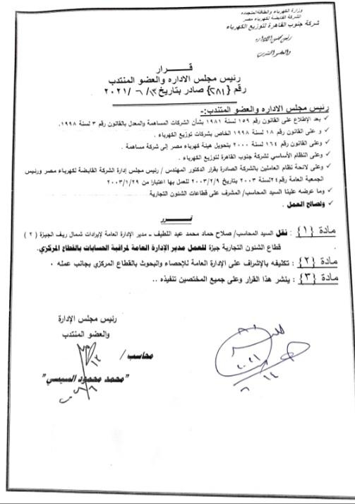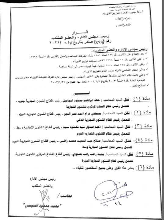 أصدر المحاسب محمد محمود السيسى رئيس شركة جنوب القاهرة لتوزيع الكهرباء قرارا بإجراء حركة تغييرات برؤساء قطاعات الشئون التجارية شملت