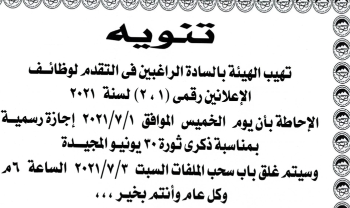 أهابت هيئة المحطات النووية الراغبين في التقدم لوظائف الاعلانين رقم (1/2) لسنه 2021 ، الإحاطة بأن يوم الخميس الموافق 1/7/2021 ، إجازة رسميه بمناسبه ذكرى ثوره 30 يونيو المجيده ،وسيتم غلق باب سحب الملفات يوم السبت 3/7/2021 ، الساعه 6 مساءا .