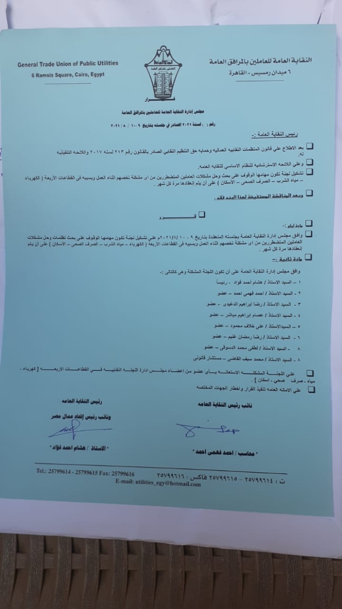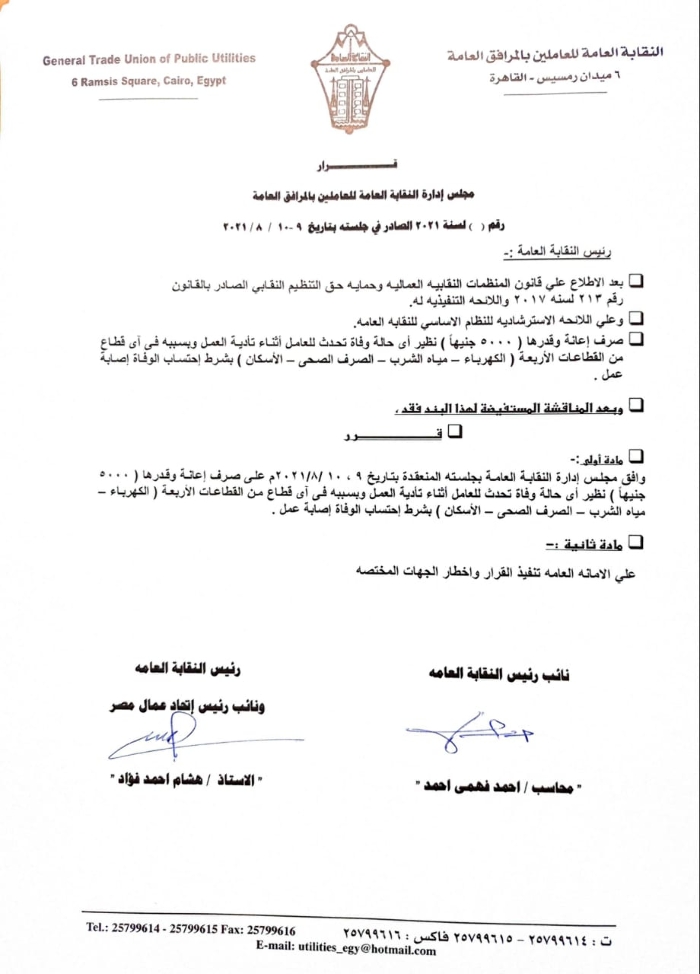 وافق مجلس إدارة النقابة العامة للعاملين بالمرافق العامة بجلسته المنعقدة بتاريخ 9 , 10 / 8 / 2021 برئاسة المستشار هشام فؤاد القائم بأعمال رئيس النقابة العامة للعاملين بالمرافق على عدة قرارات منها :_