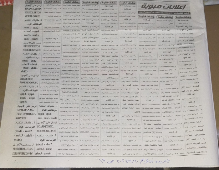 علما بأنه لن ينظر في الطلبات التي ترد على اي ايميل مخالف للايميل المحدد لها او بعد الميعاد المحدد بالاعلان ولا يجوز التقدم لاكثر من وظيفة واردة بالاعلان