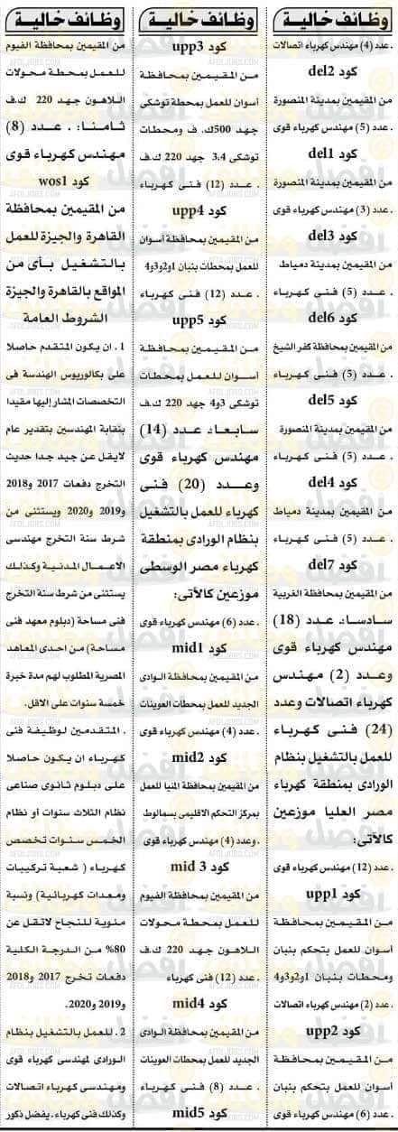 أعلنت الشركة المصرية لنقل الكهرباء عن حاجتها لشغل عدد من الوظائف من مهندسين وفنيين للعمل بقطاعات الشركة والمناطق التابعة لها ووفقا للإعلان رقم 3 لسنة 2021 بهدف سد العجز في مختلف القطاعات والمناطق ولمواكبة التوسعات الكبيرة في انشاء وتطوير محطات الكهرباء ، الذي تنتهجه الدولة في الفترة الاخيرة