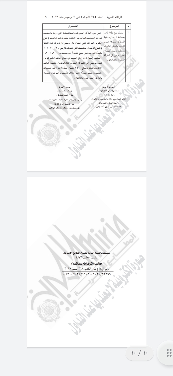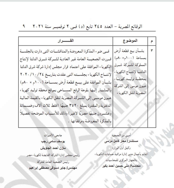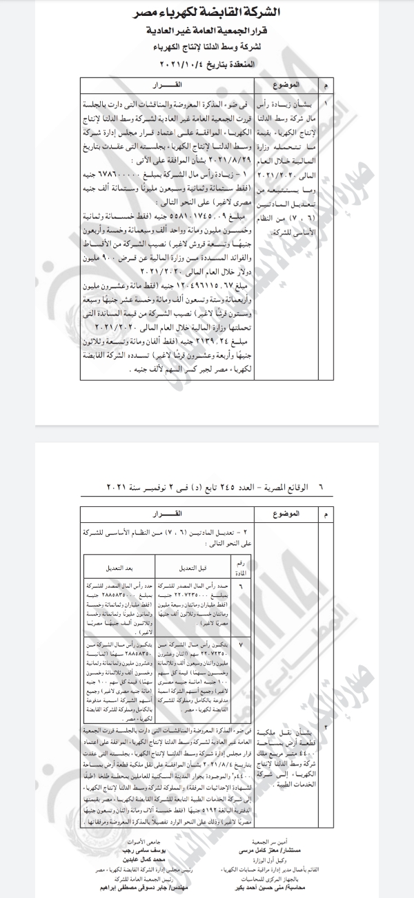 كما شملت الجريدة قرار الجمعية العامة غير العادية لشركة شرق الدلتا لإنتاج الكهرباء..