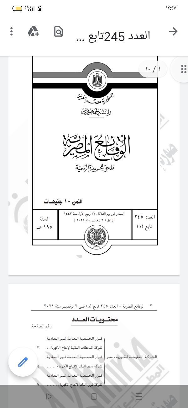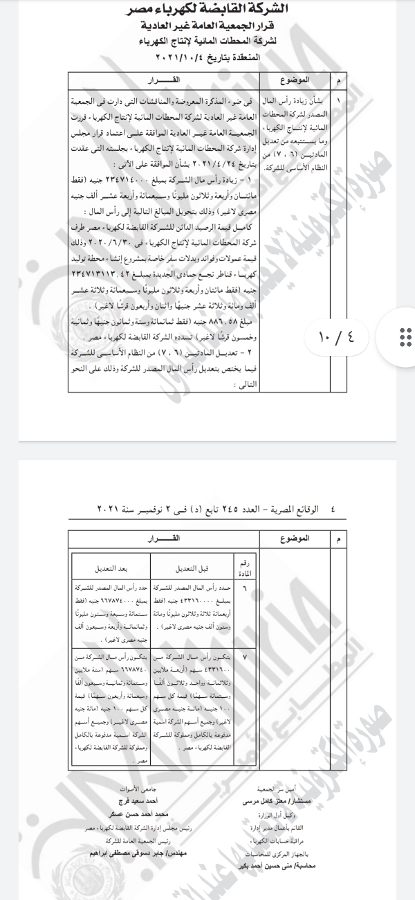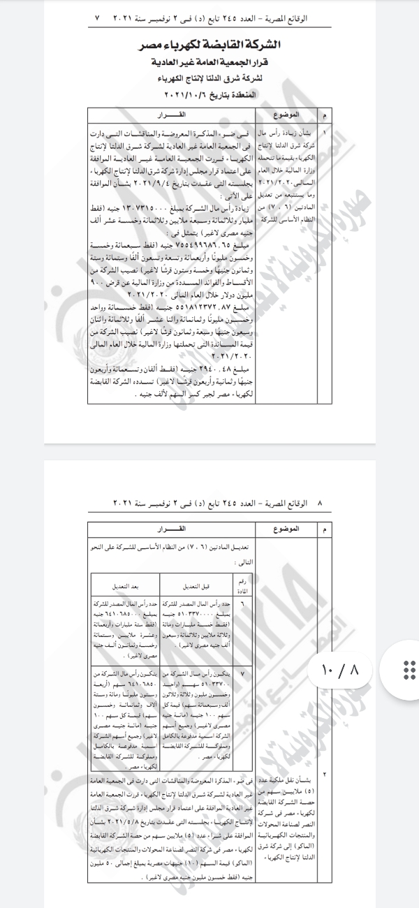 نشرت الجريدة الرسمية قرارات الشركة القابضة لكهرباء مصر، بالجمعية العامة غير العادية لشركة المحطات المائية لإنتاج الكهرباء، وشركة وسط الدلتا لإنتاج الكهرباء.