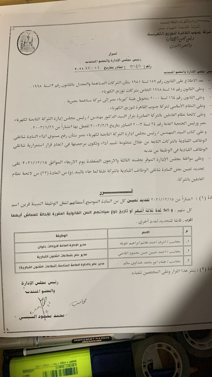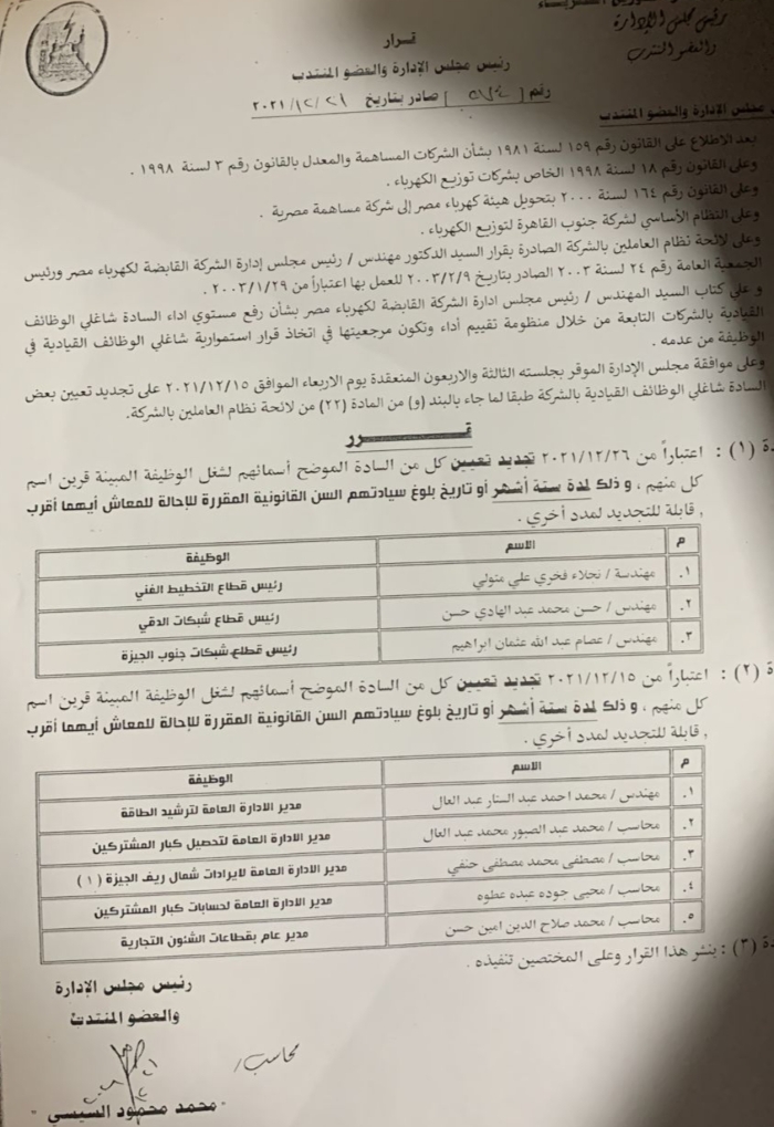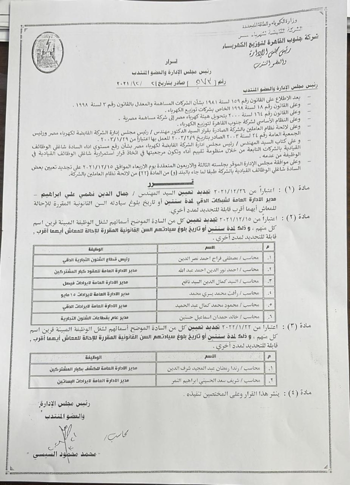 أصدر المحاسب محمد محمود السيسى رئيس مجلس إدارة شركة جنوب القاهرة لتوزيع الكهرباء عدة قرارات تضمنت تجديد تعيين قيادات بقطاعات الشئون التجارية والشبكات والمكتب الفنى لمدد جديدة تراوحت بين ٣ و٦ اشهر وكذلك التجديد لمدة عامين لآخرين ...