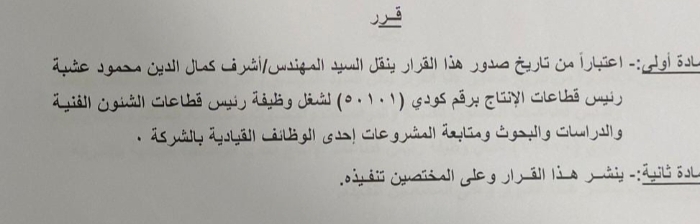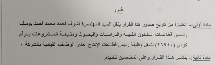 وتضمن القرار ايضا تولى المهندس أشرف يوسف رئيس قطاعات الشئون الفنية بالشركة منصب رئيس قطاعات الإنتاج بالشركة ، وذلك فى إطار حرص الشركة على الاستقرار وتبادل الخبرات بين القيادات..