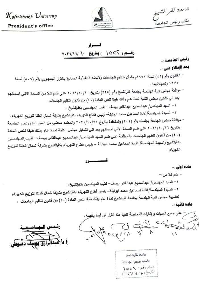 أصدر الاستاذ الدكتور عبد الرازق يوسف دسوقى رئيس جامعة كفر الشيخ قرارا تضمن ضم المهندسة غادة اسماعيل ابو كيلة رئيس قطاع كهرباء توزيع كفر الشيخ التابعة لشركة شمال الدلتا لتوزيع الكهرباء قرارا بضمها لعضوية مجلس كلية الهندسة بجامعة كفر الشيخ لمدة عام وذلك طبقا لنص المادة (٤٠) من قانون تنظيم الجامعات..