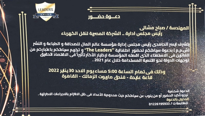 كرمت ،اليوم ، الاحد،مؤسسة عالم المال للصحافة والطباعة والنشر المهندسة صباح مشالي رئيس مجلس ادارة الشركة المصرية لنقل الكهرباء ، وذلك لفوزها في استفتاء القادة Leaders عن عام 2021 حول السيدات الأكثر تأثيرا في الإقتصاد والتنمية المستدامة نحو " الجمهورية الجديدة " ورؤية مصر 2030 ويتم اختيار الفائزين وفقا لما قدموه من اعمال جليلة للمجتمع والإقتصاد الوطني ..