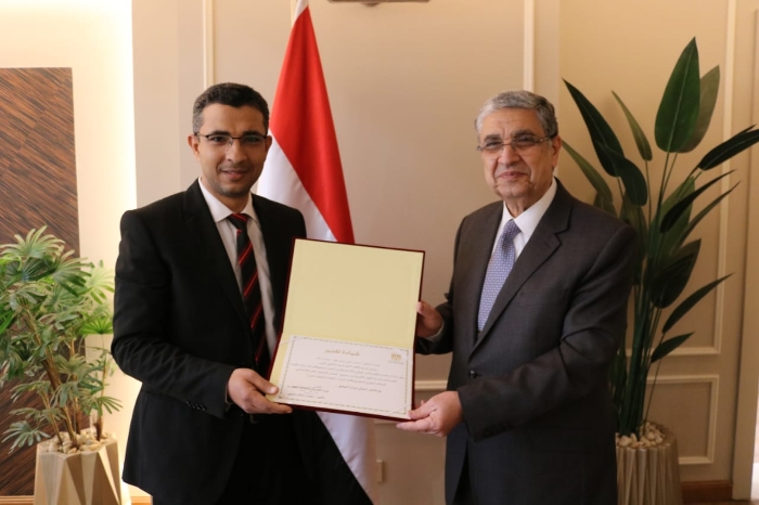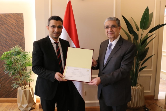 وزير الكهرباء يكرم أحد العاملين بمكتبه لحصوله على درجة الدكتوراه