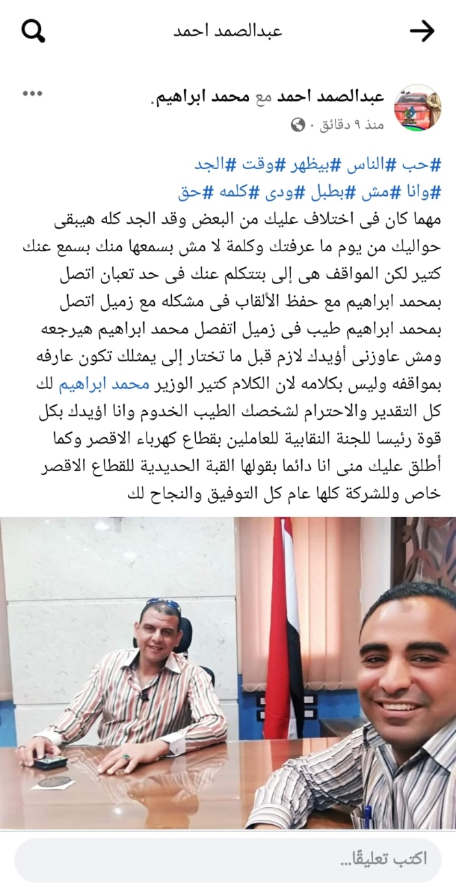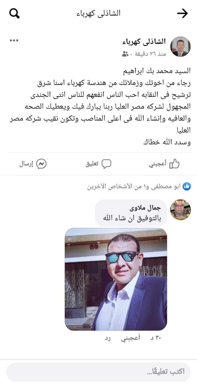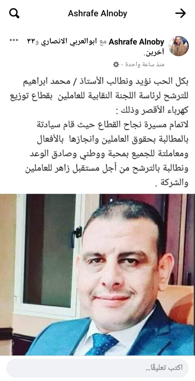 وينشر "عالم الطاقة" نماذج من تأييد وعم العاملين بمختلف قطاعات شركة مصر العليا لتوزيع الكهرباء لزميلهم محمد ابراهيم وإعلانهم دعمهم المطلق له فى انتخابات اللجان النقابية المقبلة رئيسا وممثلا عنهم ...