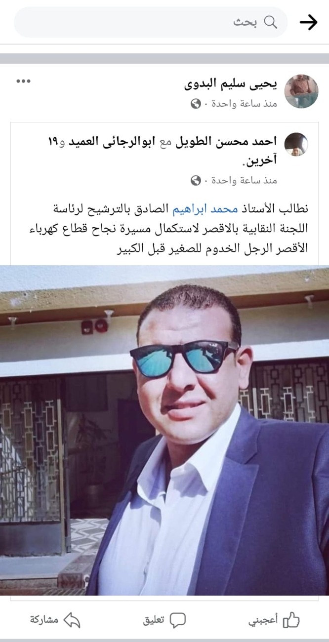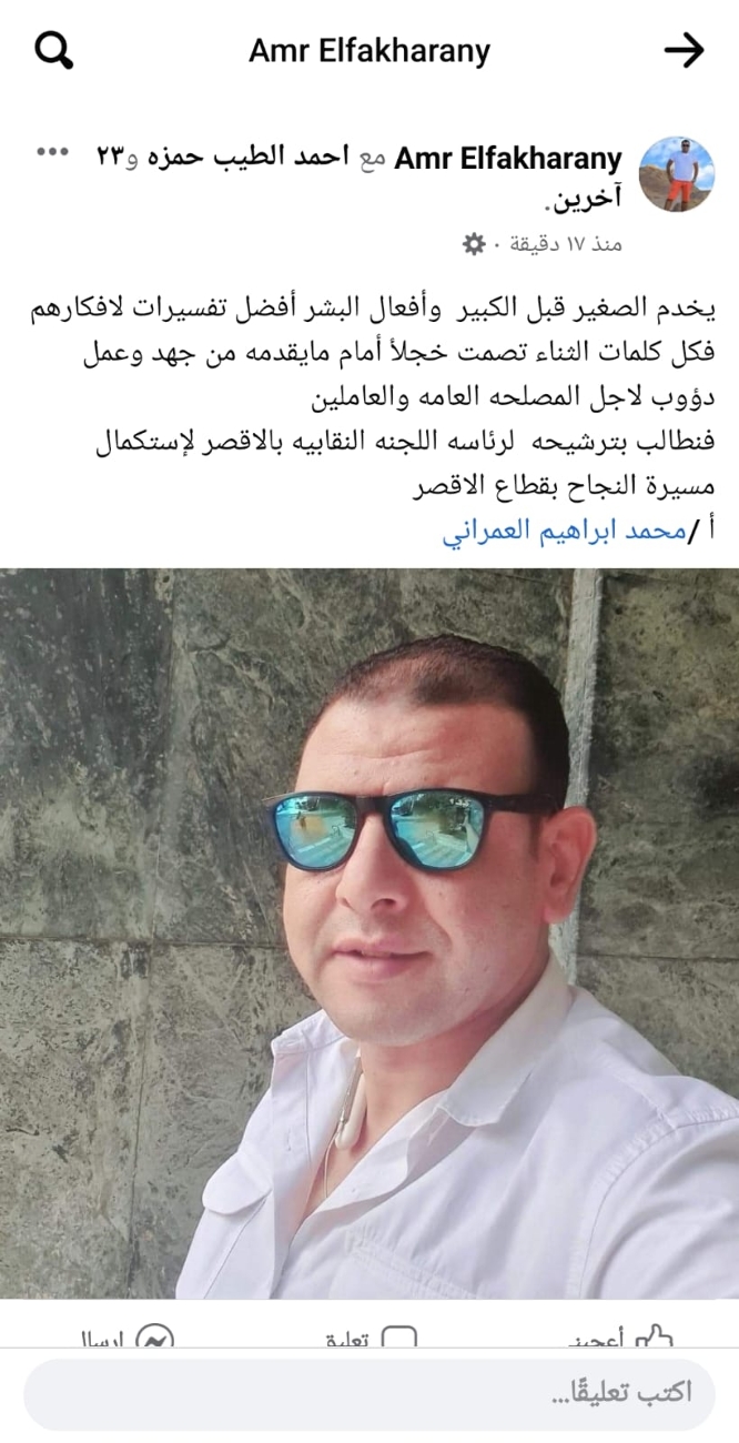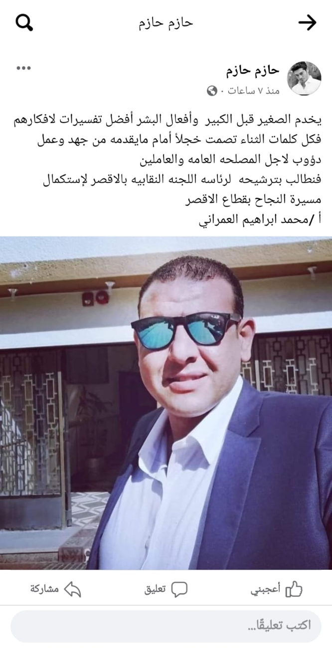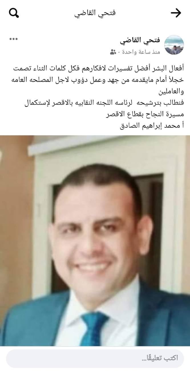 وسط تأييد ودعم حاشد.."محمد إبراهيم" يعلن ترشحه لمقعد رئاسة اللجنة النقابية بالأقصر