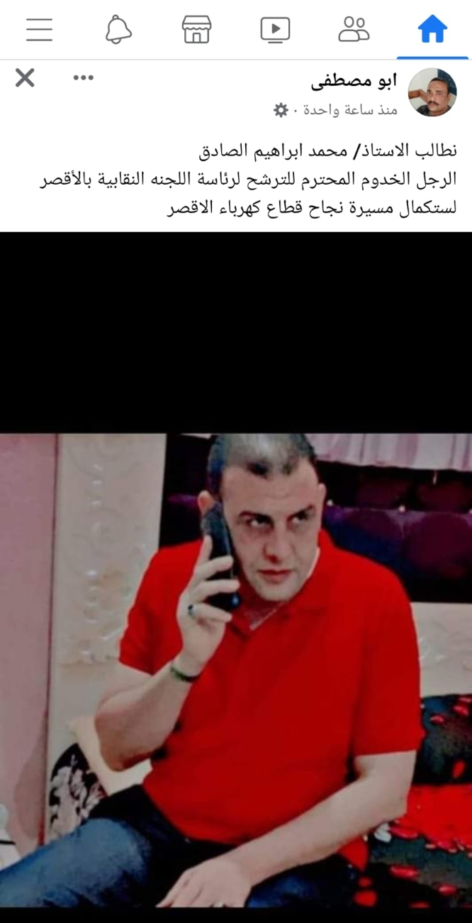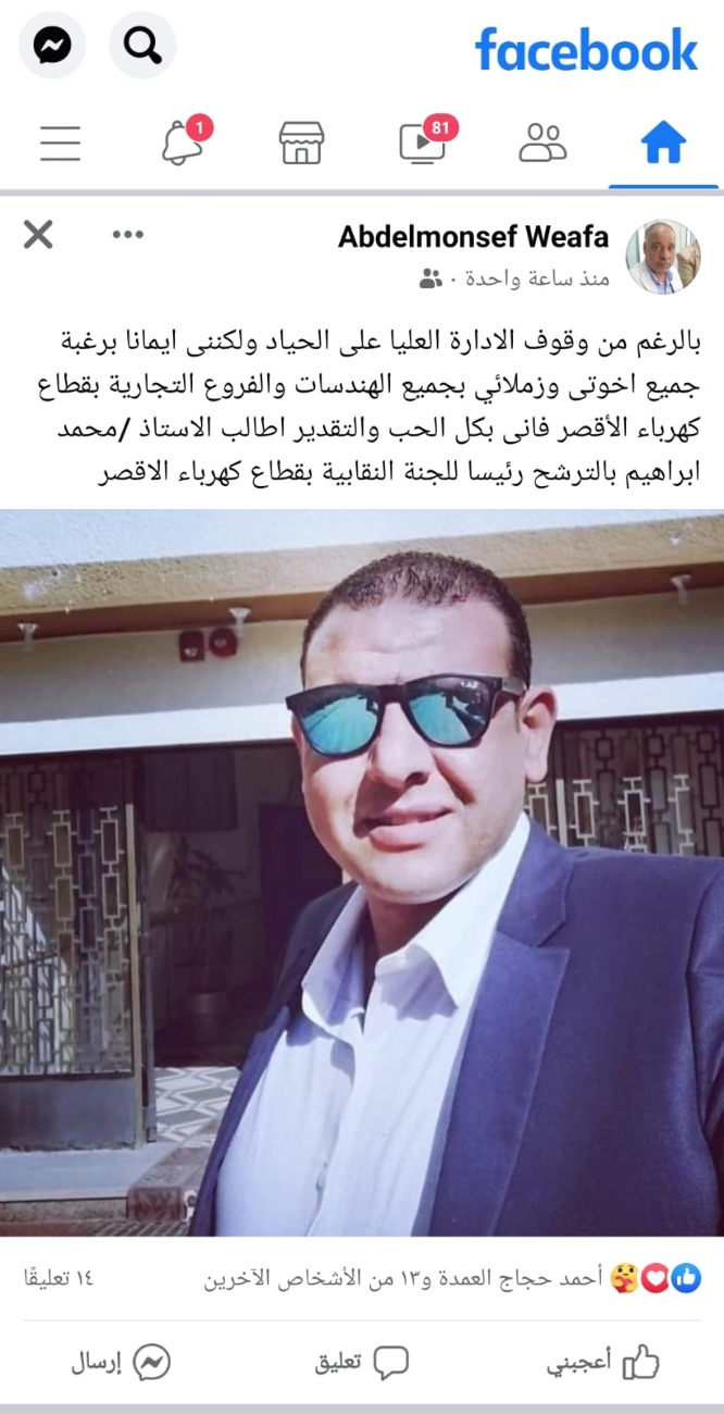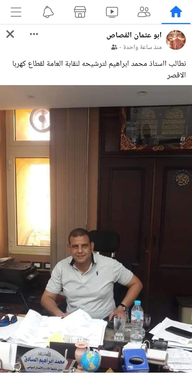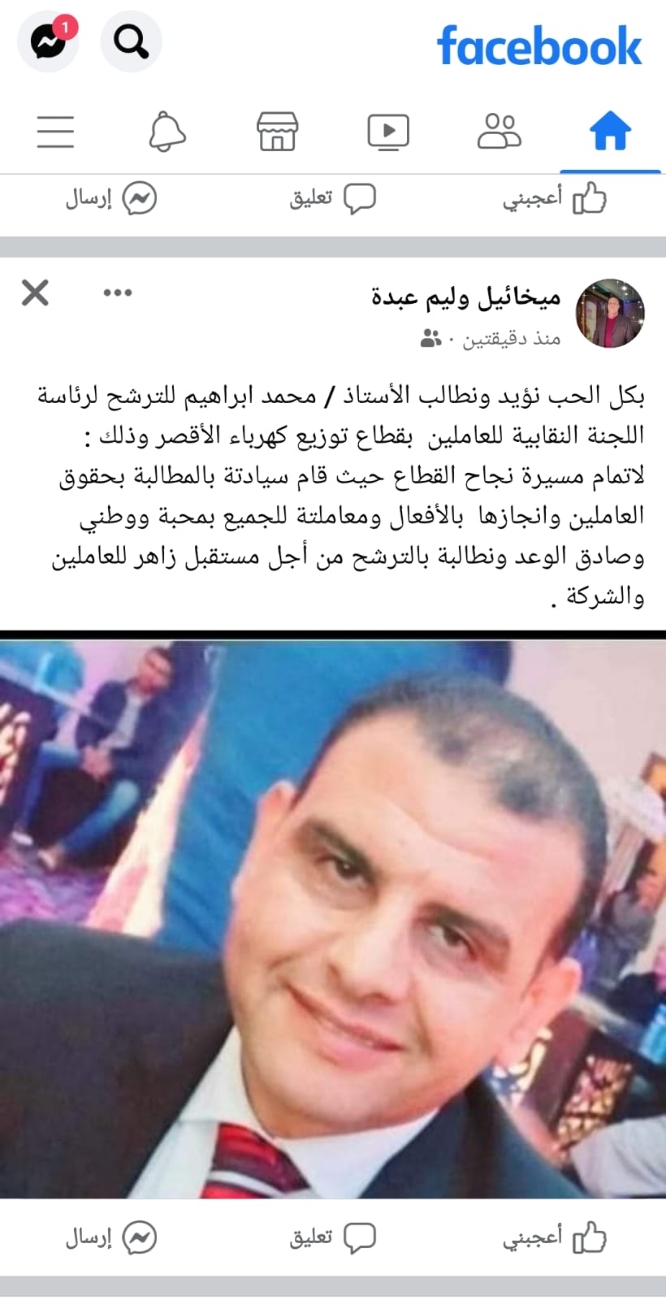 أعلن النقابى البارز محمد إبراهيم الصادق عضو اللجنة النقابية بشركة مصر العليا لتوزيع الكهرباء ترشحه على منصب رئاسة اللجنة النقابية بالأقصر فى انتخابات اللجان النقابية المرتقب إجرائها الشهر المقبل...