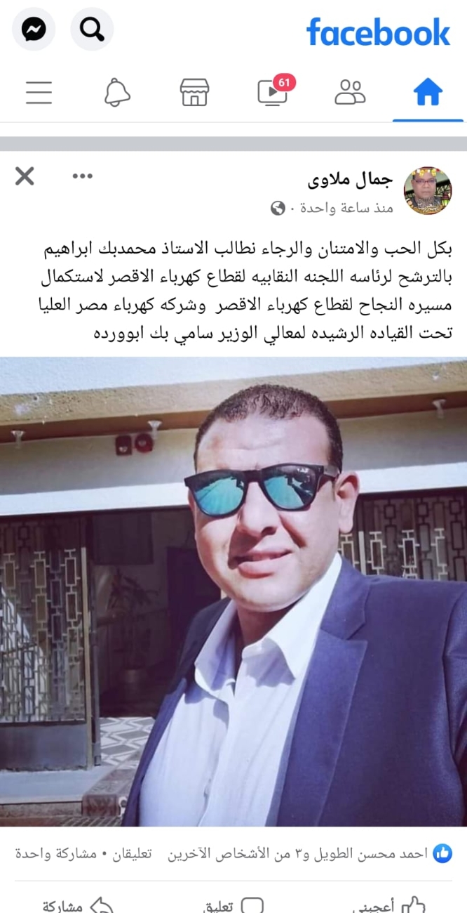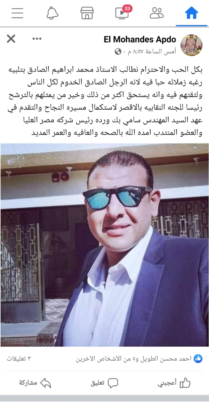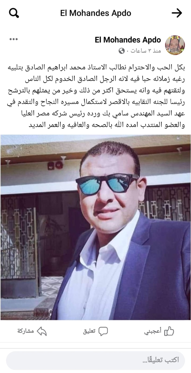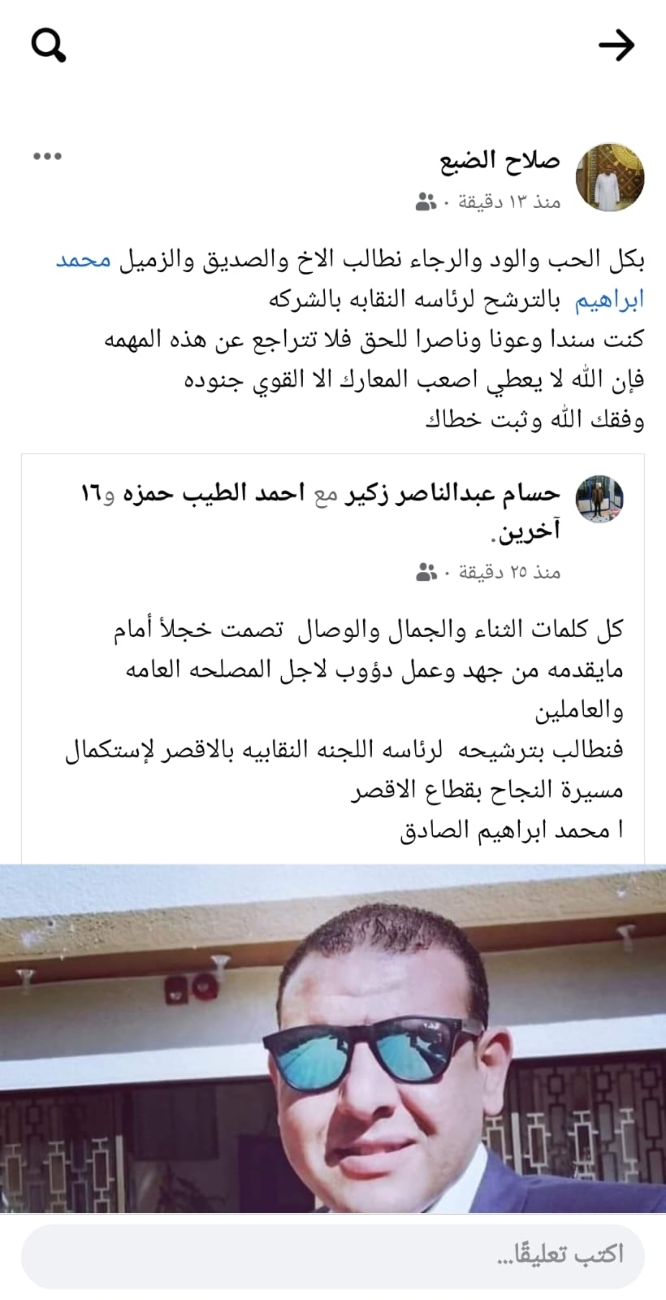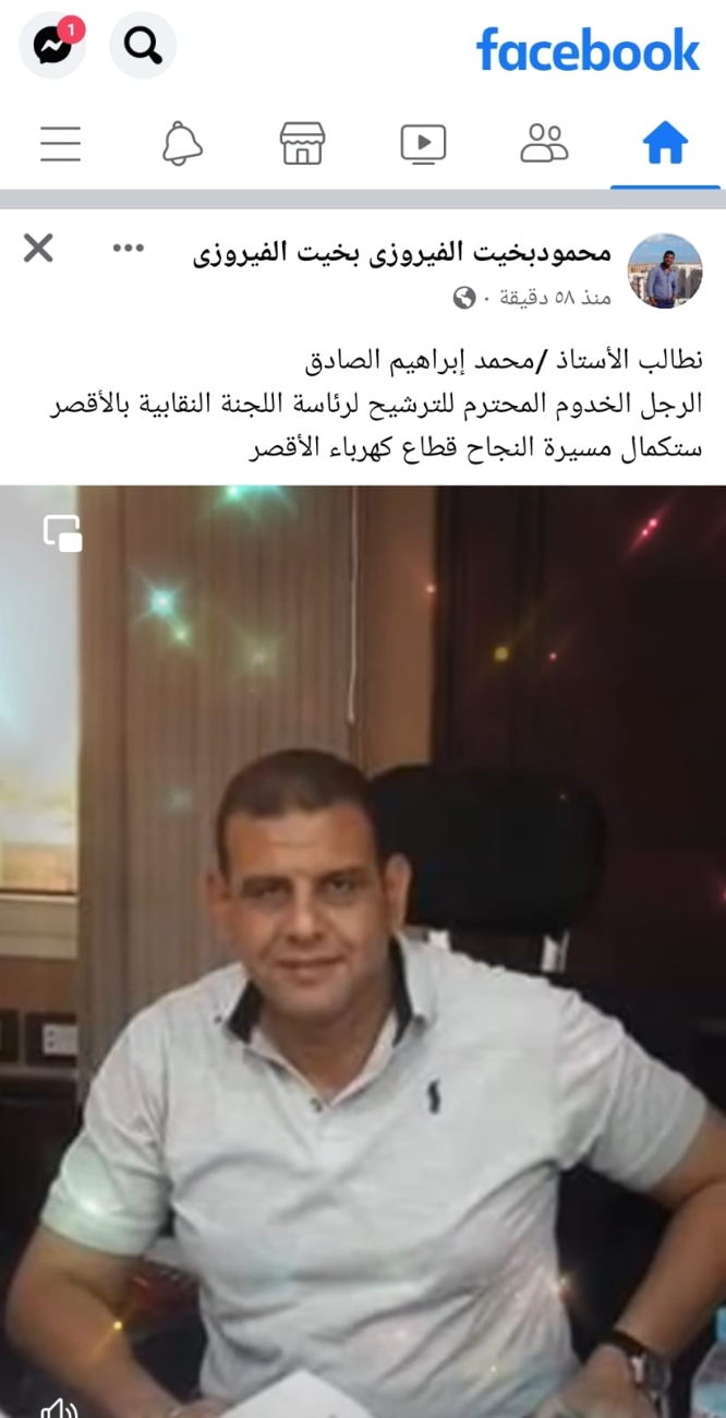 أعلن النقابى البارز محمد إبراهيم الصادق عضو اللجنة النقابية بشركة مصر العليا لتوزيع الكهرباء ترشحه على منصب رئاسة اللجنة النقابية بالأقصر فى انتخابات اللجان النقابية المرتقب إجرائها الشهر المقبل...