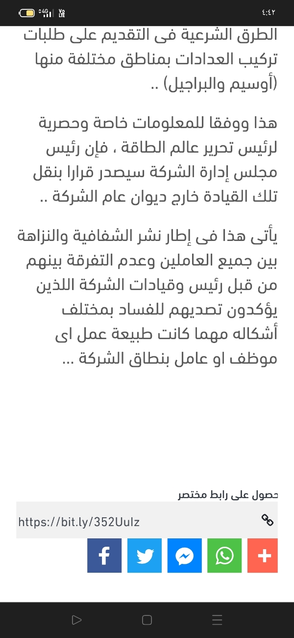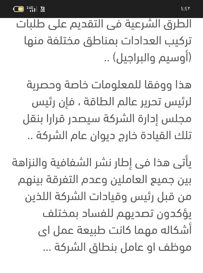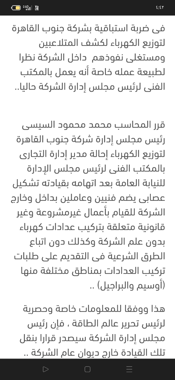 تصحيحا وتوضيحا لما تم نشره عبر موقع "عالم الطاقة" حول تورط قيادة بشركة توزيع جنوب القاهرة لتوزيع الكهرباء فى وقائع تلاعب والتأكد من ذلك الخبر من خلال اتصال هاتفي مع رئيس الشركة آنذاك الوقت حول التأكد من صحة المعلومة والذى جاء أن ما تردد صحيح وتم استبعاد تلك القيادة من العمل بالمكتب الفني التابع لرئيس الشركة ونقله للعمل بإدارة الورش بالشركة..