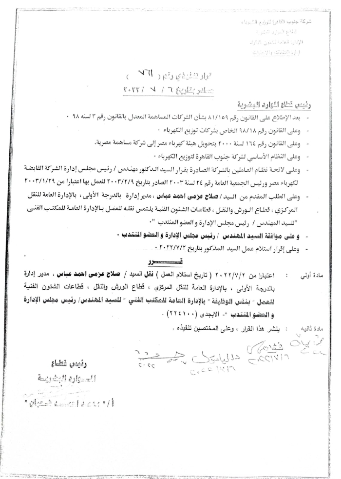 من باب الإنصاف والمصداقية..قرار بإعادة" صلاح عزمى" للعمل بالمكتب الفني لرئيس جنوب القاهرة