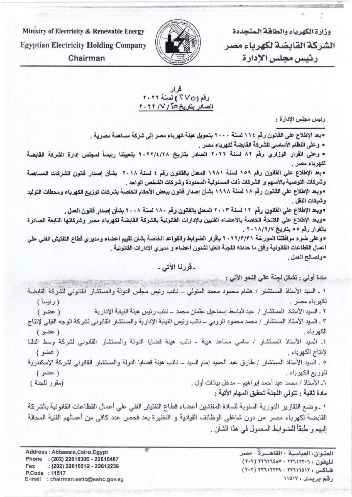 اصدر المهندس جابر دسوقى رئيس الشركة القابضة لكهرباء مصر القرار رقم 275 لسنة 2022 بتاريخ 25/7/2022 بخصوص تشكيل لجنة نواب هيئة النيابة الادارية و هيئة قضايا الدولة المستشارين بشركات الكهرباء و الشركة القابضة لكهرباء مصر تكون مهمتها وضع التقارير السنوية لأعضاء قطاع التفتيش الفنى على أعمال القطاعات القانونية من دون شاغلى الوظائف القيادية و النظيرة و فحص اعمالهم من الناحية الفنية و عرض البلاغات و الشكاوى المقدمة ضدهم على رئيس الشركة القابضة لكهرباء مصر لتقرير احالتهم للتحقيق و يجوز للجنة الإستعانة بمن تراه للمعاونة فى تحقيق مهامها و ان تقدم التوصيات الخاصة بسير العمل و انتظامه و مراقبة اعمال قطاع التفتيش الفنى على اعمال القطاعات القانونية..