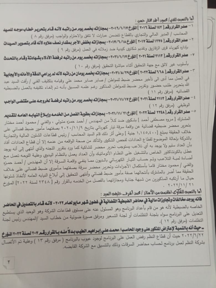 ۲- صدر القرار رقم [ 1506 لسنة ٢٠٢٠ ] المؤرخ ٢٠٢٠/۸/۲۱ لأهماله والتراخي في تشغيل وصيانة وتامين مكونات شبكة الجهد المتوسط