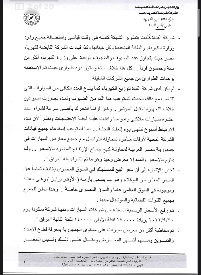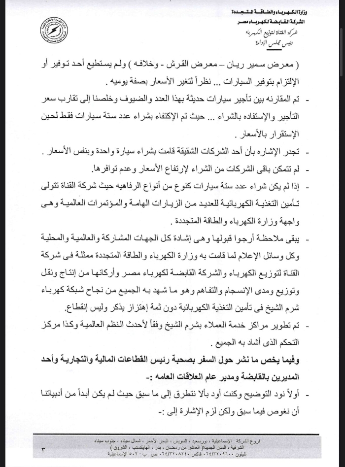 يتضح مما سبق أنه لم يكن شراء عدد ستة سيارات كنوع من أنواع الرفاهيه حيث شركة القناة تتولى تأمين التغذية الكهربائية للعديد من الزيارات الهامة والمؤتمرات العالمية وهي واجهة وزارة الكهرباء والطاقة المتجددة .