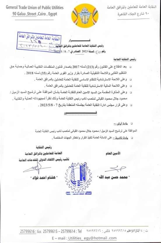أصدر المستشار هشام فؤاد رئيس النقابة العامة للعاملين بالمرافق العامة ونائب رئيس الاتحاد الدولي للخدمات قرارا تضمن ترقية الأستاذ محمود جلال القباني رئيس اللجنة النقابية عن العاملين بالديوان العام وقطاع الغربية بشركة جنوب الدلتا لتوزيع الكهرباء وعضو مجلس إدارة الشركة لتوليه منصب نائب رئيس النقابة العامة وذلك نظرا لمجهوداته العملية والنقابية...