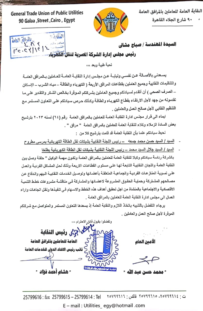أصدر المستشار هشام فؤاد رئيس النقابة العامة للعاملين بالمرافق العامة قرارات تضمنت ترقية كلا من النقابى السيد جلال السيد محمد رئيس اللجنة النقابية بمنطقة كهرباء الدلتا بمنصب وكيل النقابة العامة للعاملين بالمرافق العامة وتضمن القرار ايضا ترقية النقابى السيد حسن محمد جمعه بمنصب وكيل النقابة العامة للعاملين بالمرافق العامة ، وكذلك ترقية النقابى محمد حسن حامد بمنصب وكيلا النقابة العامة للعاملين بالمرافق العامة..