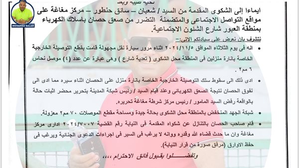 كشف مصدر مسئول بقطاع تشغيل شمال المنيا التابع للشركة ، انه في يوم الثلاثاء ٥ نوفمبر الماضي اثناء مرور سيارة نقل مجهولة قامت بقطع التوصيلة الخارجية الخاصة بإنارة منزلين في المنطقة محل الشكوى (تعدية الشارع) وهي عبارة عن عدد ٤ مرصل نحاس ادي ذلك لسقوط التوصيلة الخارجية بإنارة المنزل علي الحصان مما تسبب في صعقه ٠٠٠وعند قيام رئيس الشبكة بتحرير محضر اثبات حالة بالواقعة رفض مأمور قسم شرطة مغاغه تحريره