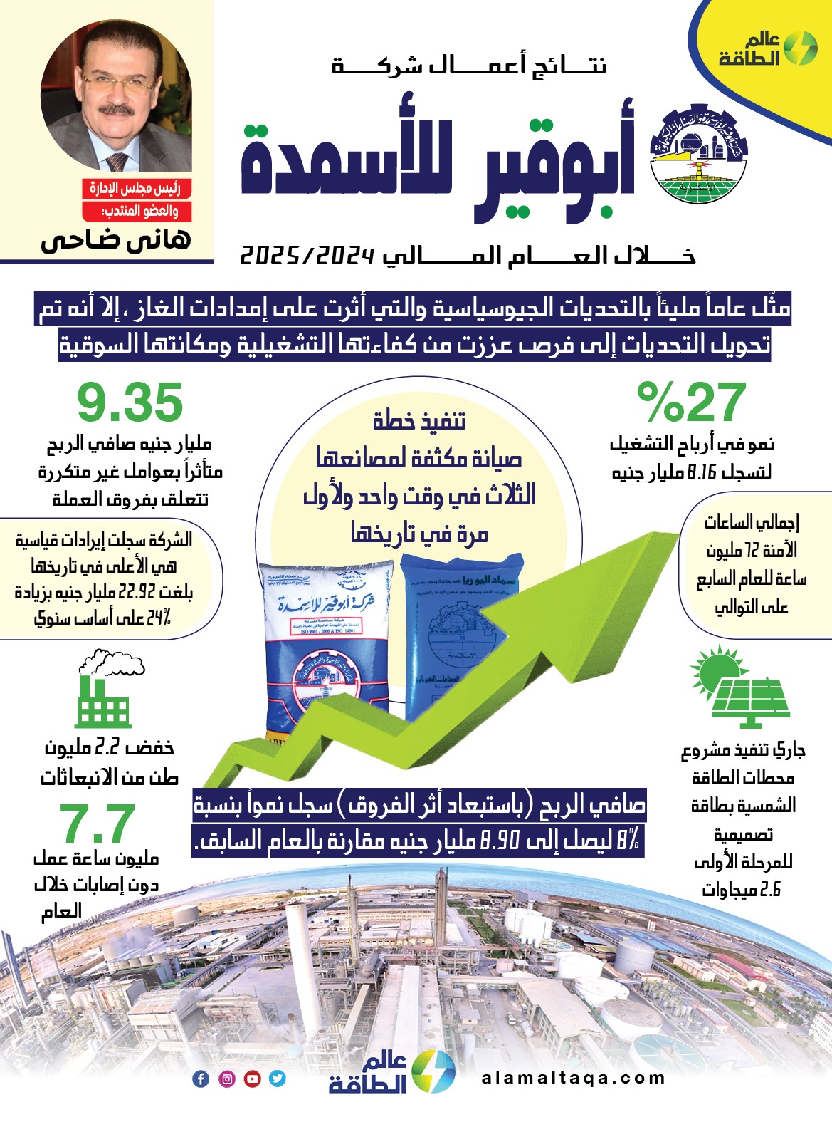 وبهذا الأداء المتوازن بين النمو والتوسع والاستدامة، تواصل أبوقير للأسمدة تعزيز مكانتها كأحد أبرز منتجي الأسمدة النيتروجينية محلياً وعالمياً.