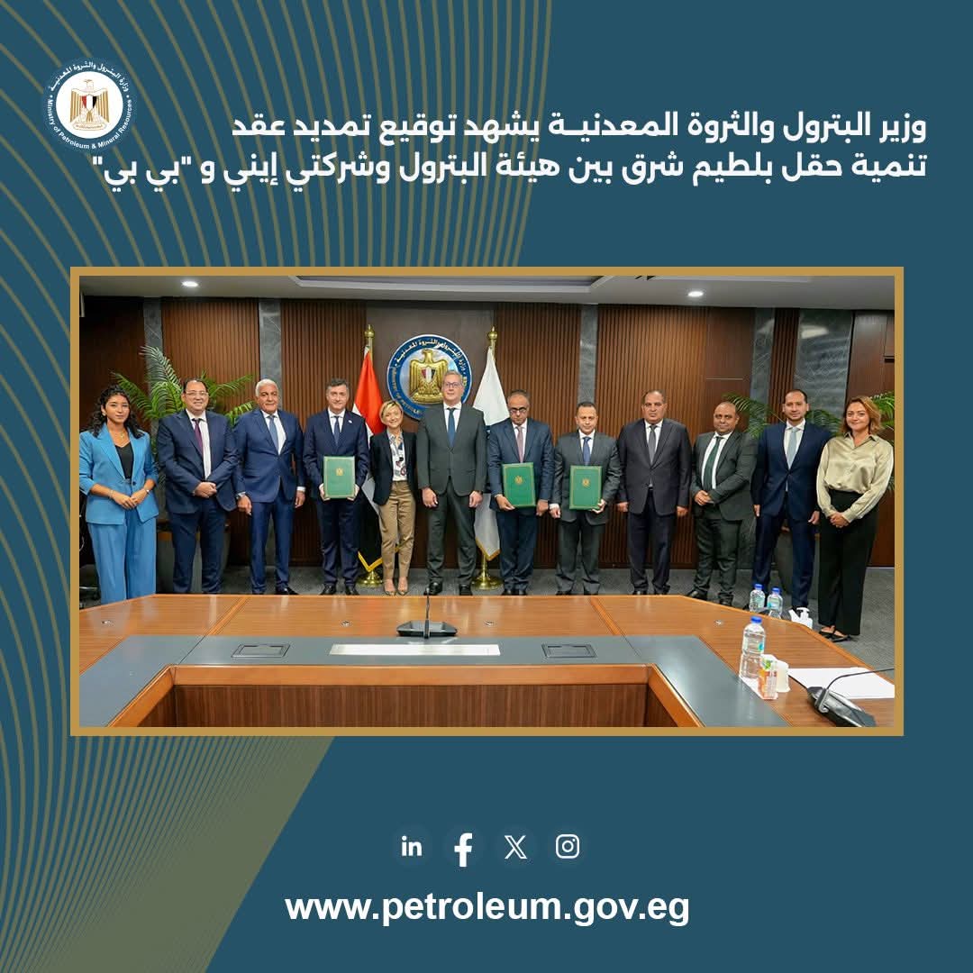 شهد المهندس كريم بدوي وزير البترول والثروة المعدنية، ومارتينا أوبتسي، رئيسة منطقة شمال أفريقيا والمشرق العربي بشركة إيني الإيطالية، توقيع اتفاق تمديد عقد تنمية حقل "بلطيم شرق" بمنطقة التزام بلطيم بدلتا النيل بين شركتي "إيني" الإيطالية و"بي بي" البريطانية، وذلك في إطار تعزيز جهود البحث والاستكشاف والتنمية بهدف زيادة الإنتاج من البترول والغاز الطبيعي.