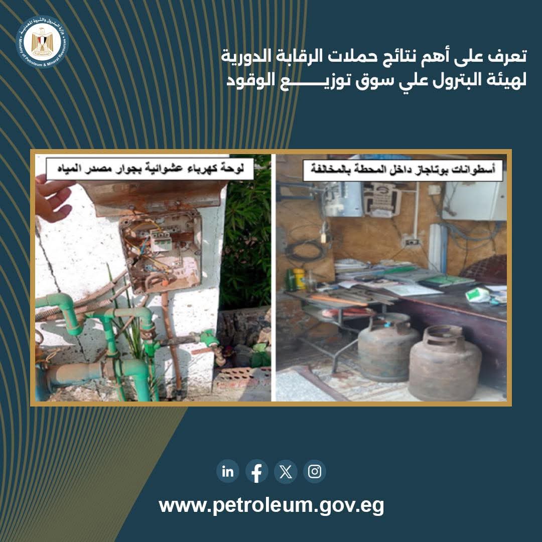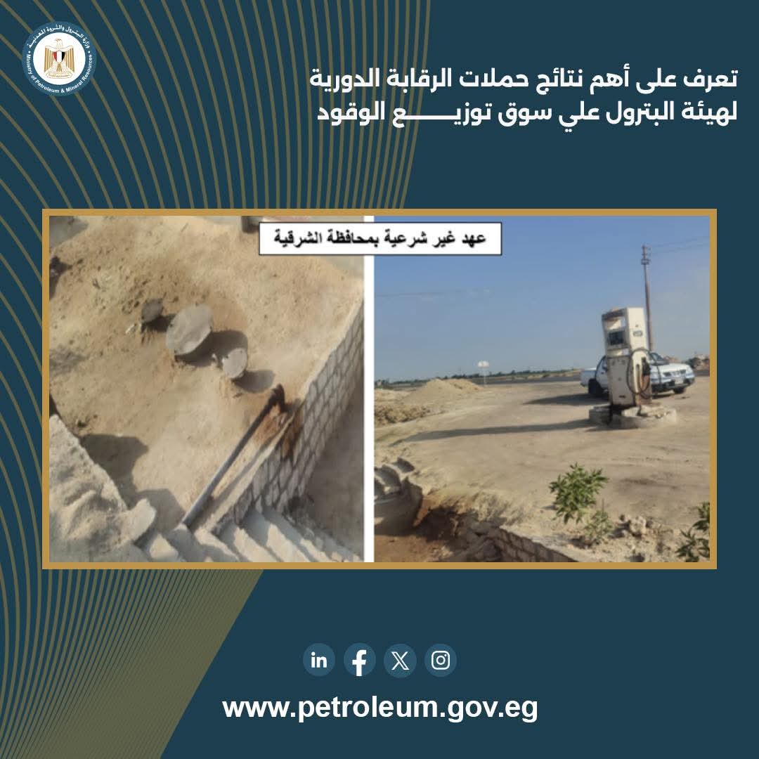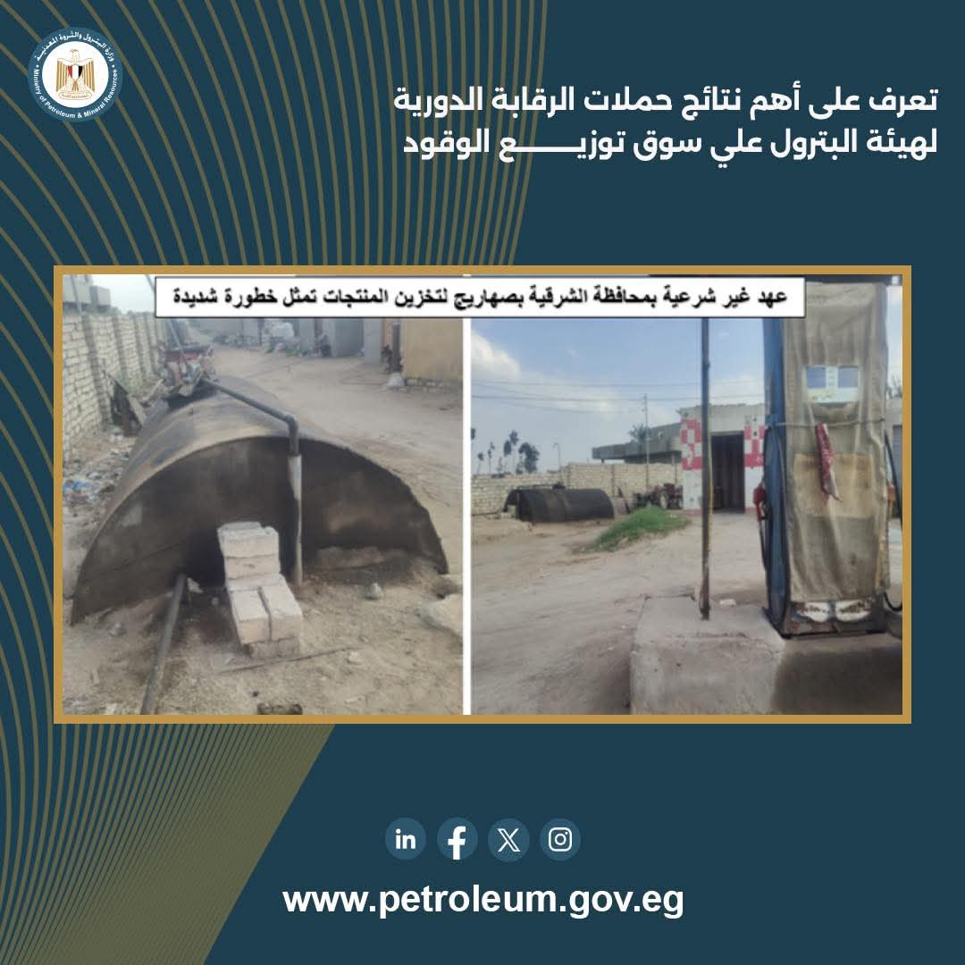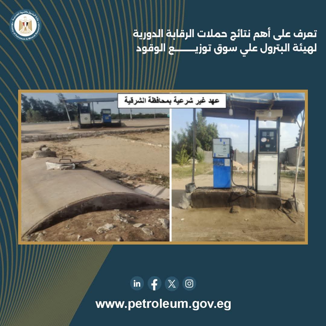 فيما تم ضبط بؤرة بمنطقة الحسينية بمحافظة الشرقية بها (7) نقاط توزيع غير شرعية أو مرخصة قانوناً و طلمبات تموين وخزانات وقود بدون آية تراخيص أو موافقات ، وجار اتخاذ الإجراءات القانونية .