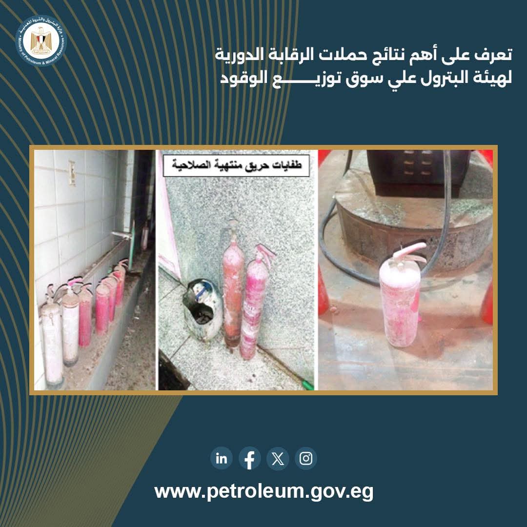 واستمراراً لجولات التفتيش الدورية والتي شملت 28 محطة وقود بمحافظات القاهرة والقليوبيةوالإسكندرية والبحيرة والدقهلية وكفر الشيخ والغربية والشرقية ، وتم رصد مخالفات فنية منها سوء توزيع لأماكن لوحات الكهرباء وعشوائية الوصلات وعدم تأمينها وانتشار المخلفات واسطوانات البوتاجاز وما تمثله من خطورة داخل المحطات ووجود طفايات حريق منتهية الصلاحية كما تم تطهير صهاريج خزانات الوقود التي وجد بها نسبة مياه وتم مخاطبة شركات التسويق المعنية بكافة الملاحظات والمخالفات لسرعة التلافي .