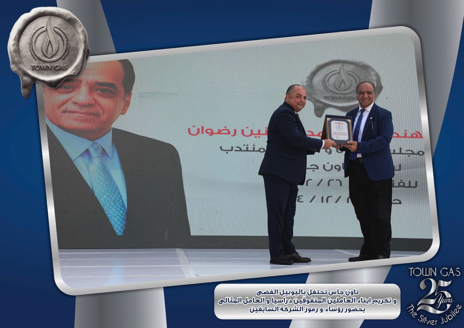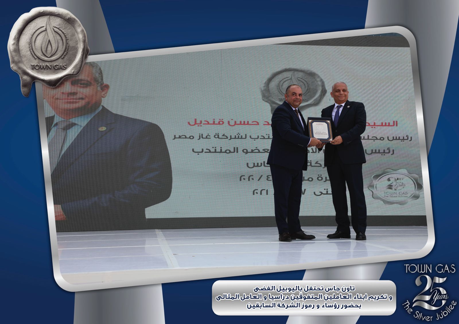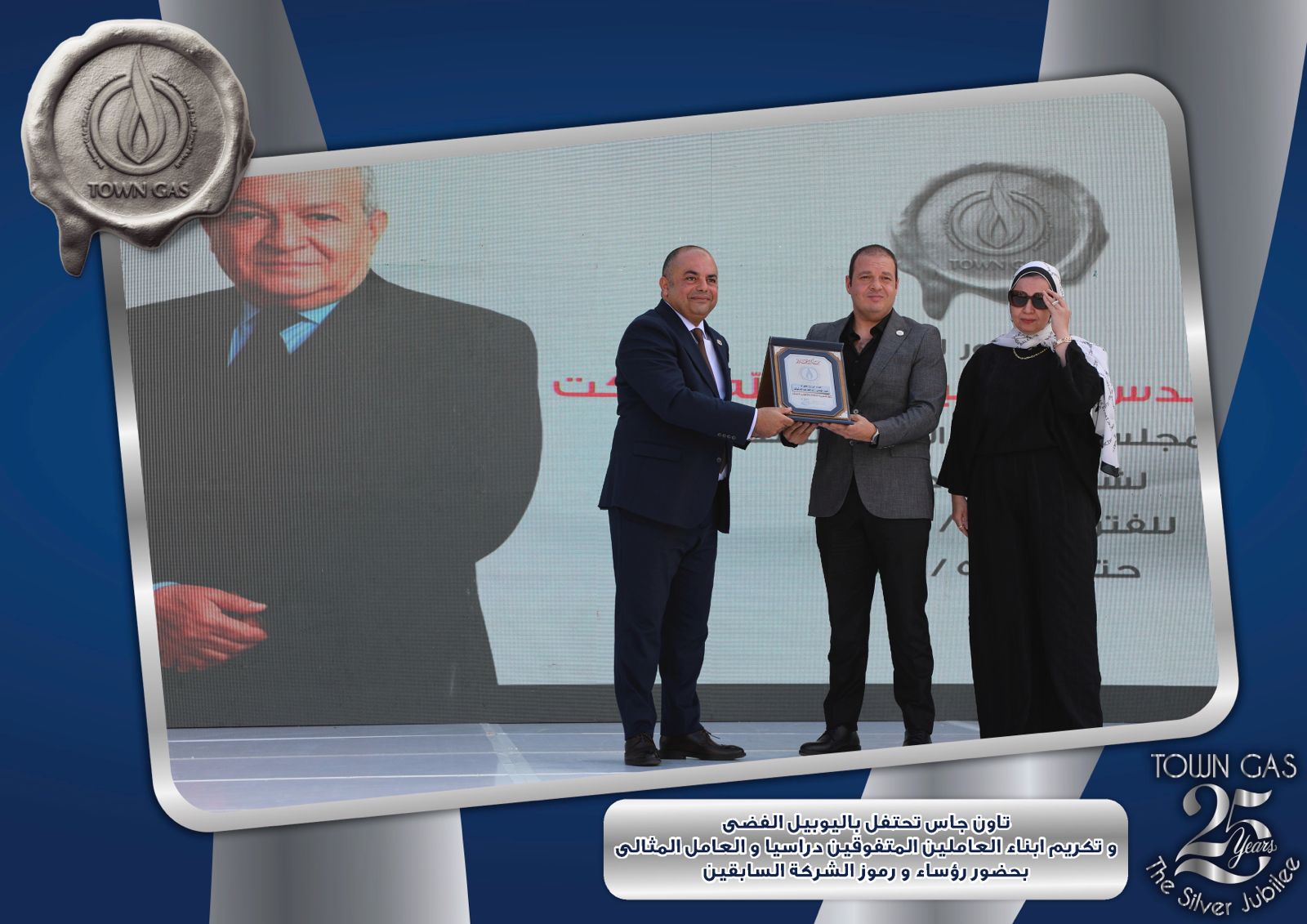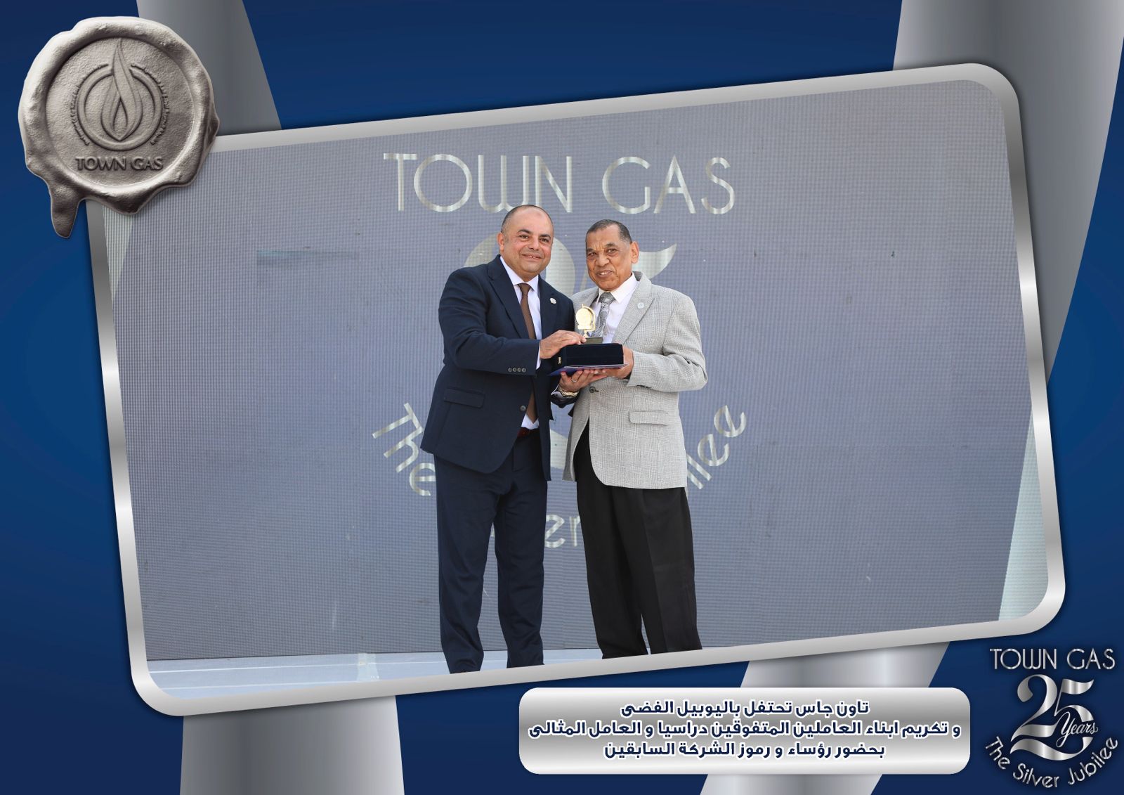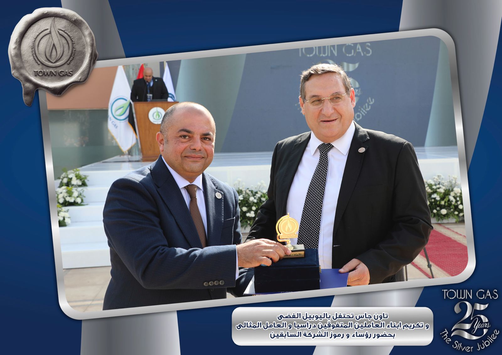 ايمانا بدور العنصر البشرى فى بناء تاريخ الشركات وتحقيق الإنجازات احتفلت شركة تاون جاس باليوبيل الفضى لتأسيس الشركة ضمن الفاعليات السنوية لتكريم العامل المثالى والمتفوقين من ابناء العاملين فى مختلف المراحل التعليمية وايضا تكريم الفرق الرياضية للشركة والتى حصلت على المراكز الاولى على مستوى قطاع البترول .