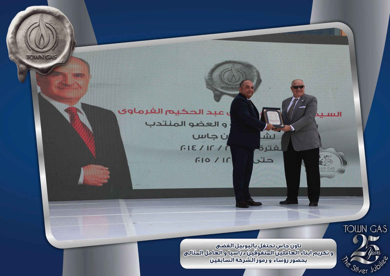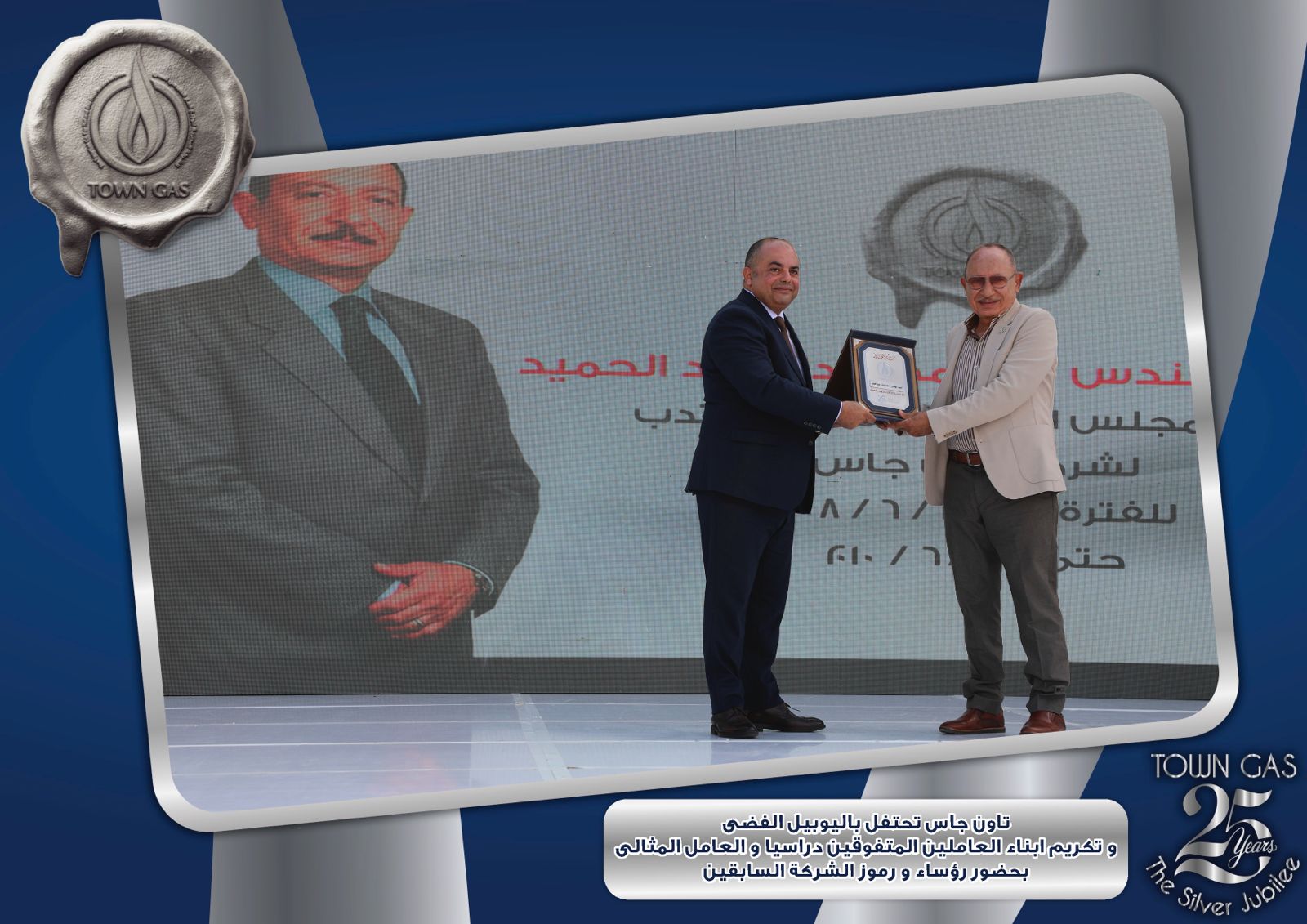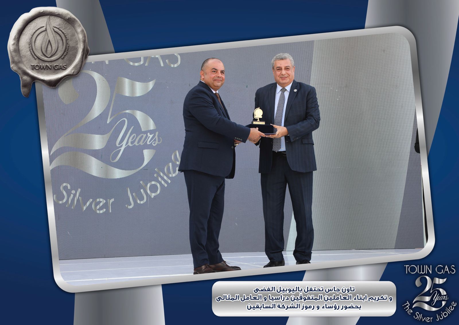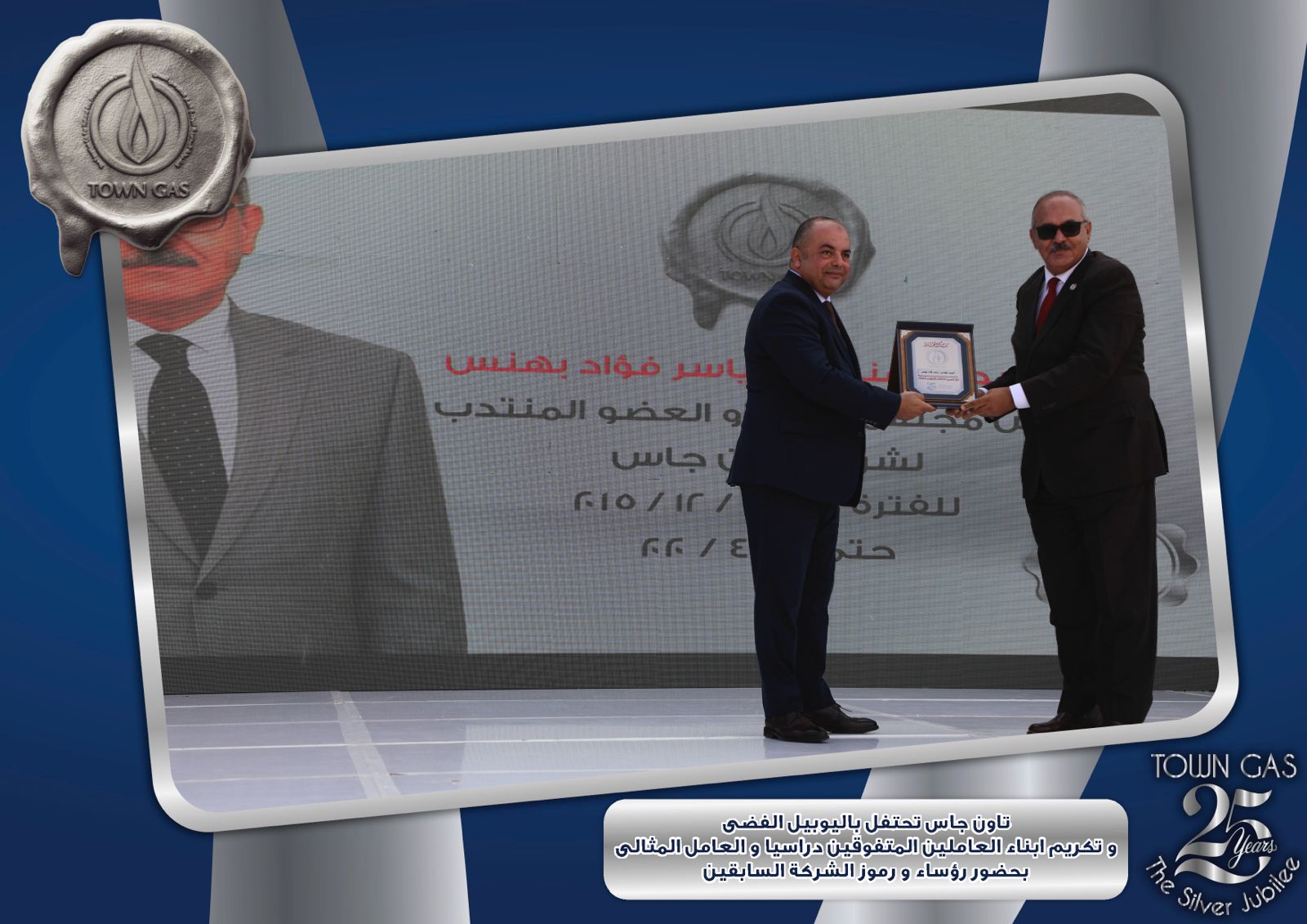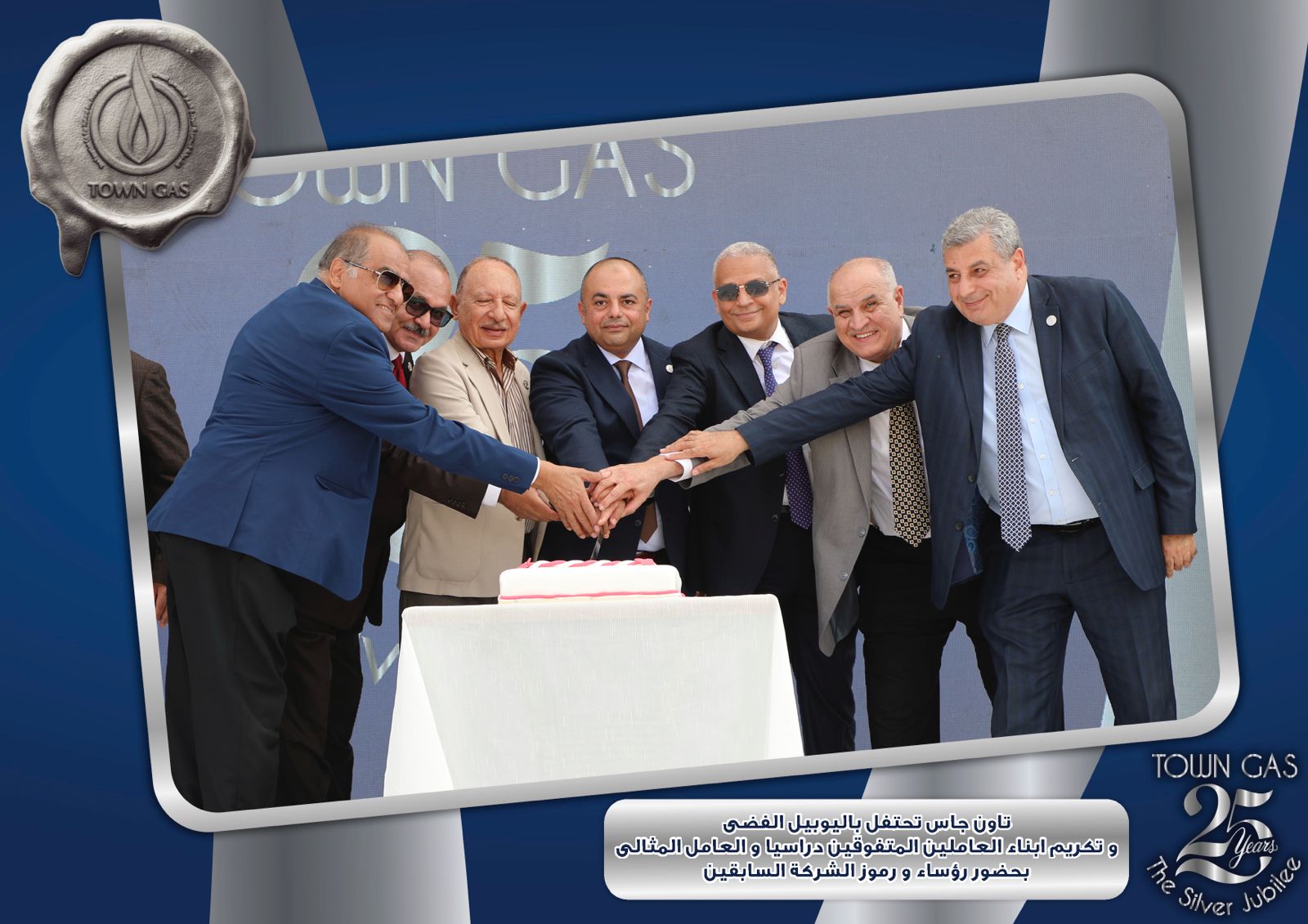 ايمانا بدور العنصر البشرى فى بناء تاريخ الشركات وتحقيق الإنجازات احتفلت شركة تاون جاس باليوبيل الفضى لتأسيس الشركة ضمن الفاعليات السنوية لتكريم العامل المثالى والمتفوقين من ابناء العاملين فى مختلف المراحل التعليمية وايضا تكريم الفرق الرياضية للشركة والتى حصلت على المراكز الاولى على مستوى قطاع البترول .