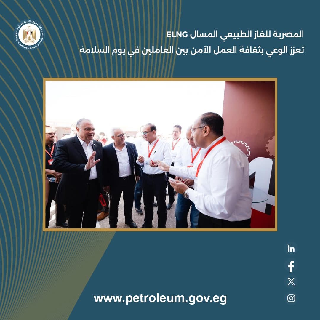 نظمت الشركة المصرية للغاز الطبيعي المسال ELNG يوم السلامة السنوي للشركة في مقرها بمدينة إدكو ، بحضور المهندس يس محمد وكيل أول وزارة البترول والثروة المعدنية والمشرف على السلامة والصحة المهنية والبيئة وكفاءة الطاقة والمناخ، والمهندس محمد البهنسي رئيس الشركة ، والدكتور أشرف رمضان، مساعد رئيس شركة إيجاس للسلامة والبيئة، وممثلي الشركاء من شل مصر وبتروناس مصر.
