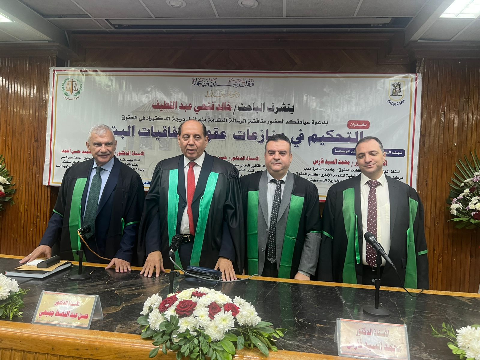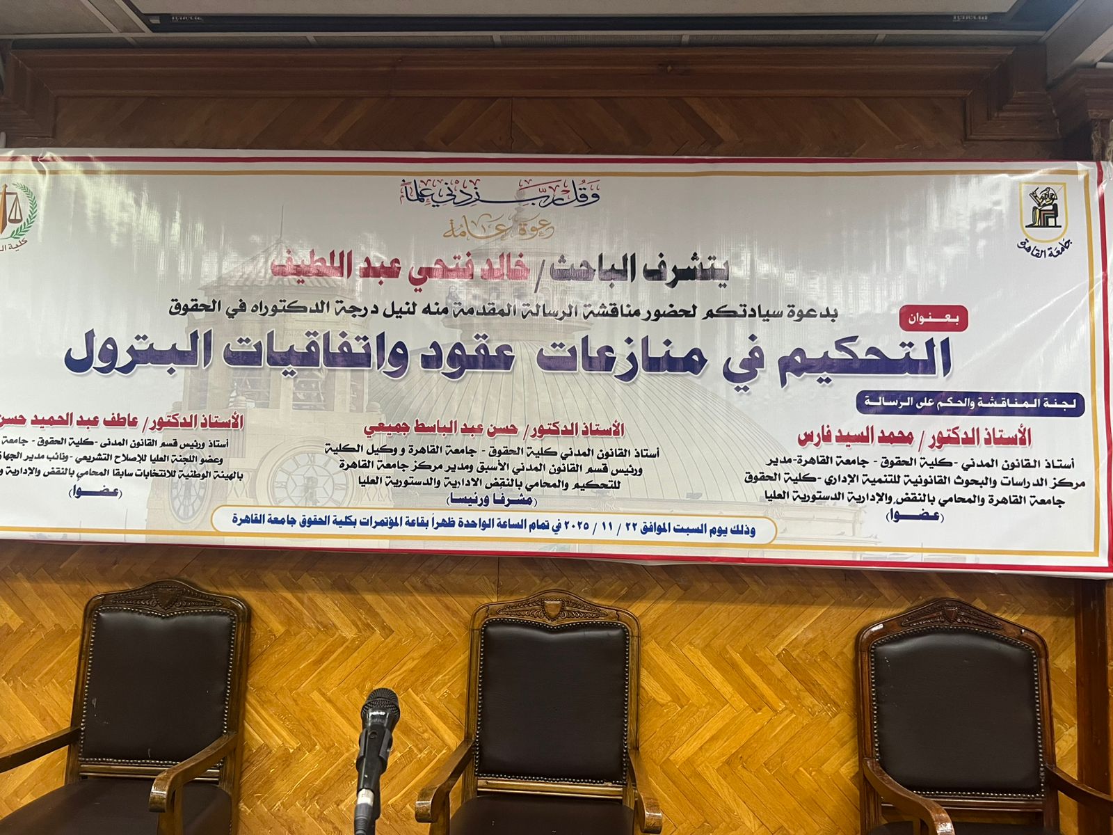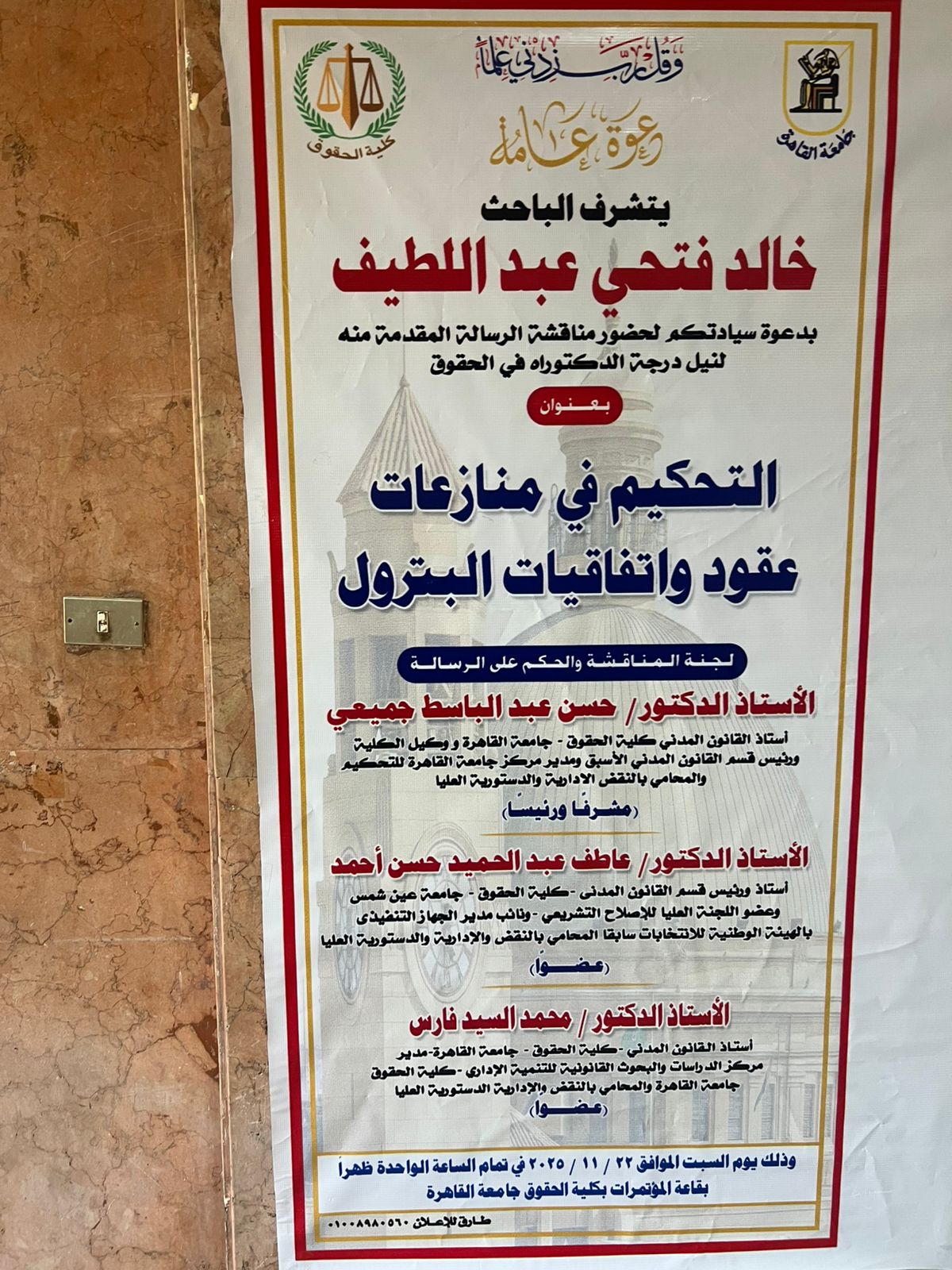 ظهر يوم السبت الموافق ٢٠٢٥/١١/٢٢ حصل الاستاذ / خالد فتحي عبد اللطيف المدير العام بالشؤون القانونية بالشركة المصرية للخدمات البترولية ( ابسكو ) علي درجة الدكتوراة في القانون بتقدير امتياز من كليه الحقوق جامعة القاهرة ( اولي و اعرق الجامعات المصرية) وعنوانها : ( التحكيم في منازعات عقود و اتفاقيات البترول)