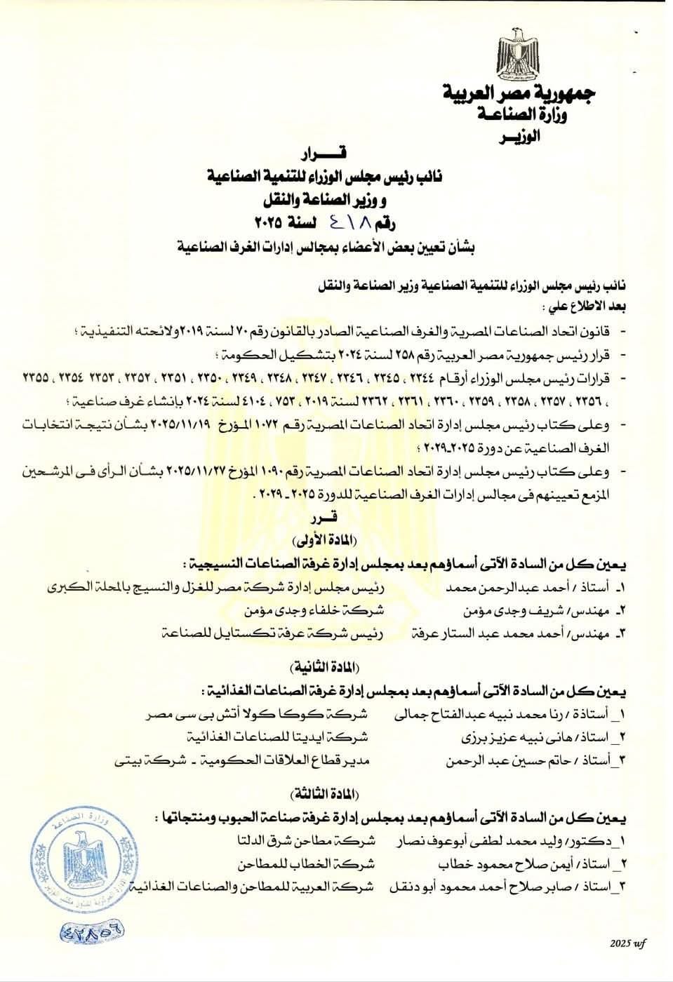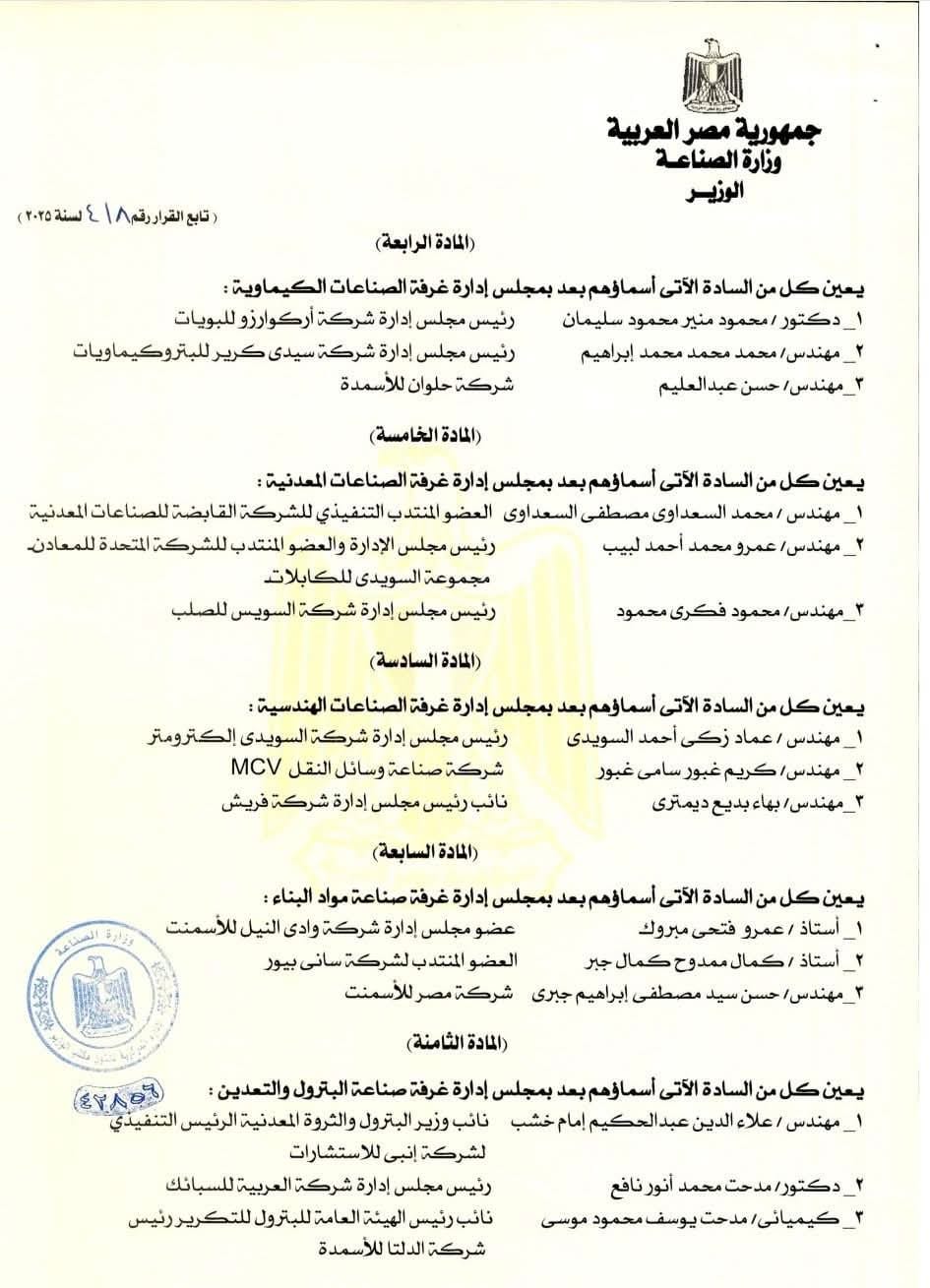 قرر نائب رئيس مجلس الوزراء الفريق كامل الوزير رقم 418لسنة 2025 تعيين المهندس حسن عبدالعليم عضو مجلس إدارة غرفة الصناعات الكيماوية للدورة 2025/2029