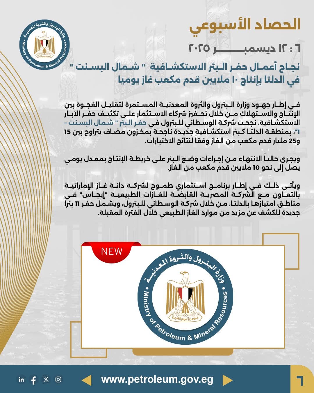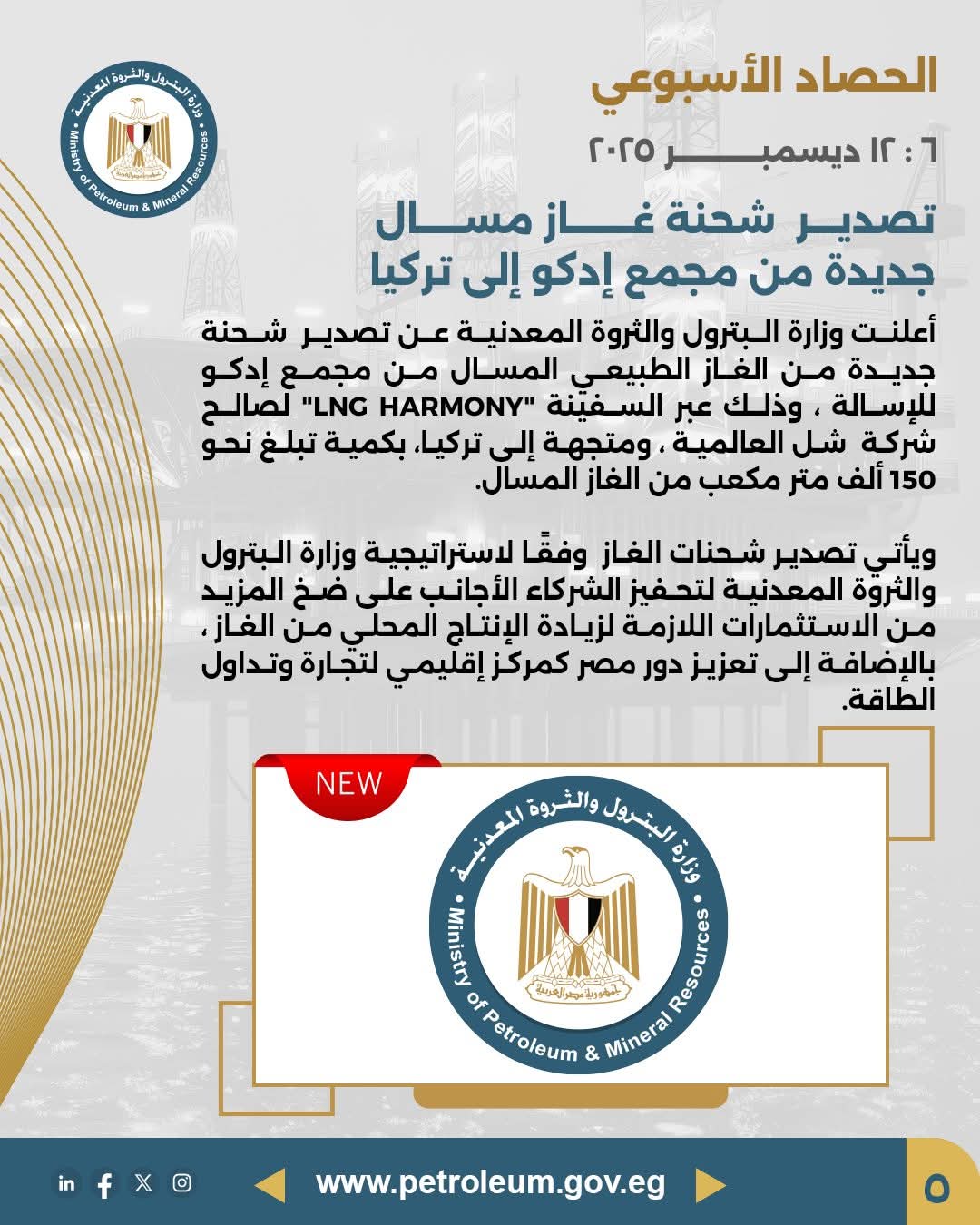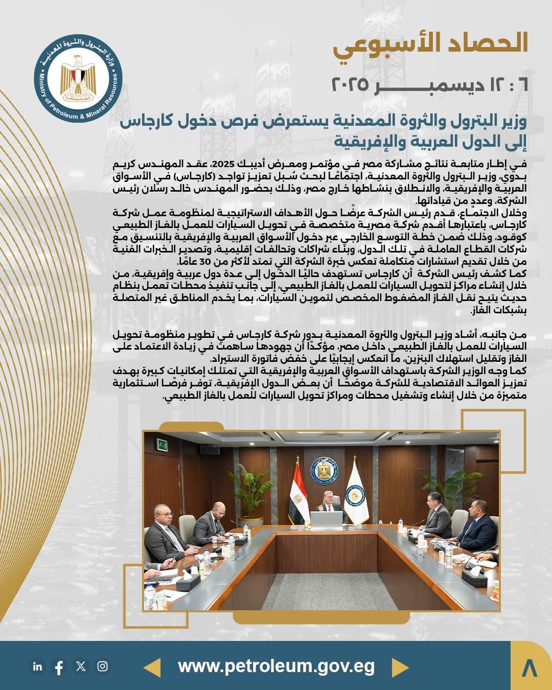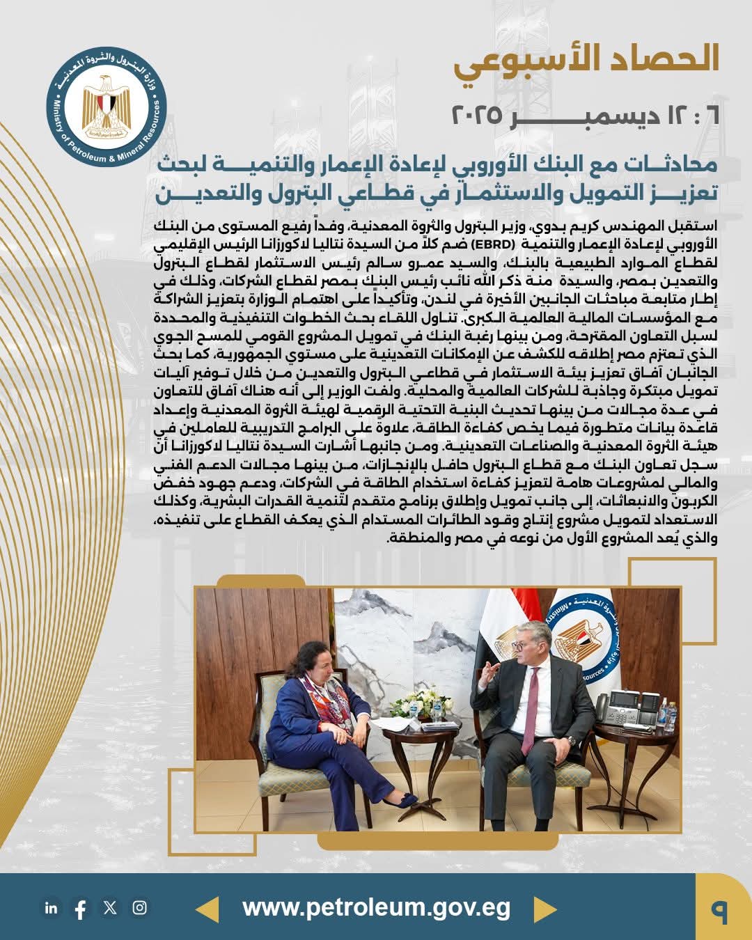 أصدرت وزارة البترول والثروة المعدنية الحصاد الأسبوعي حول ابرز أنشطة الوزارة خلال الأسبوع المنقضي، وما شهده من اجتماعات ومشاركات للمهندس كريم بدوي وزير البترول والثروة المعدنية، في إطار متابعة تنفيذ محاور استراتيجية الوزارة.
