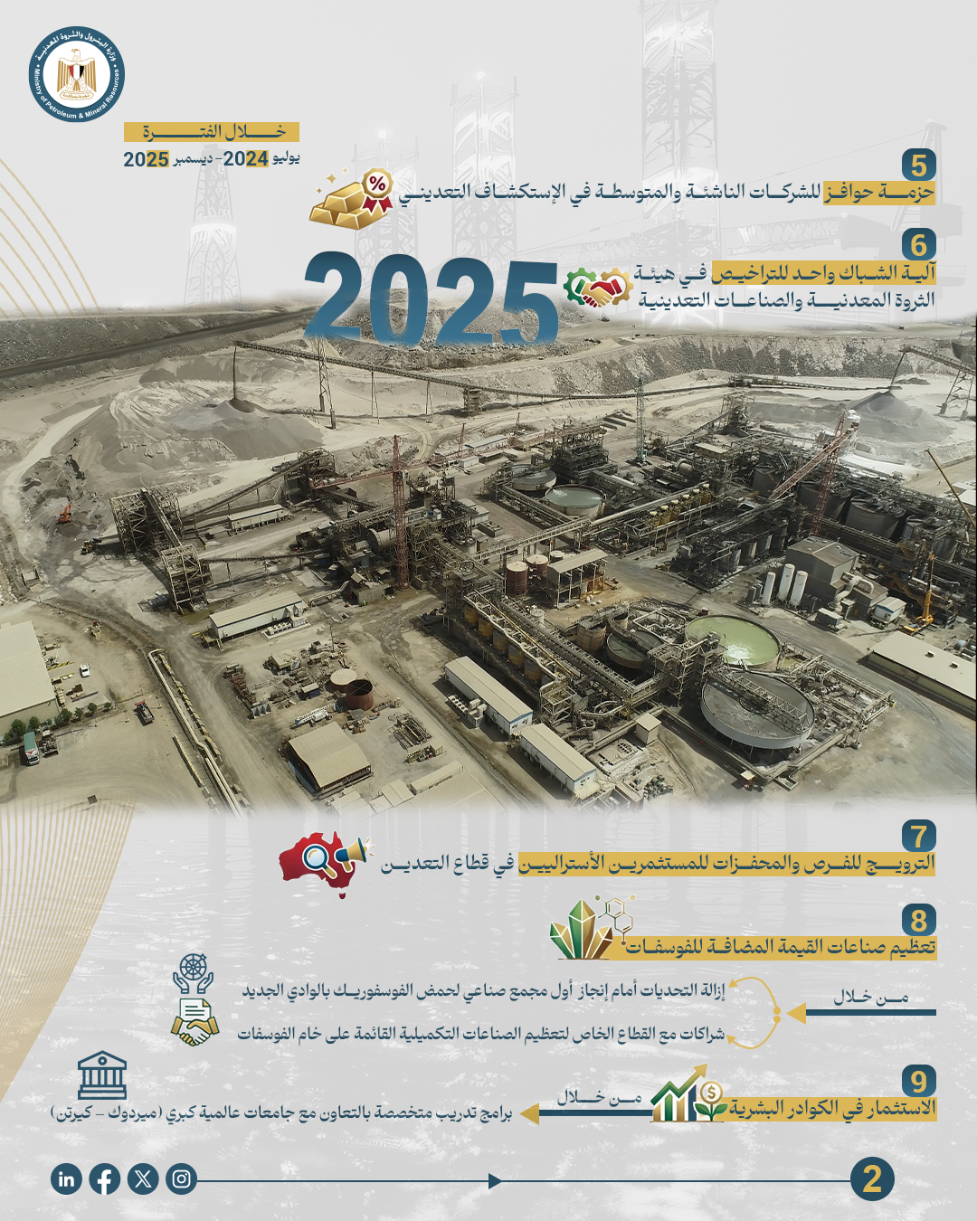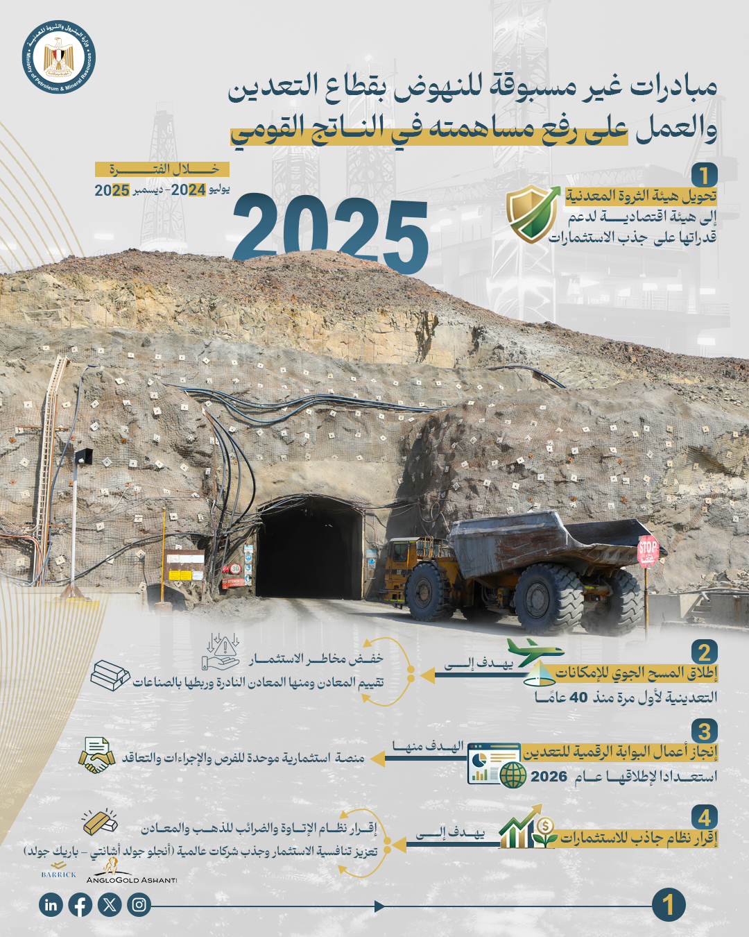 عام 2025 كان عامًا هامًا ومحوريًا في بدء رسم خريطة جديدة لقطاعات البترول والغاز والتعدين في مصر، لتجاوز التحديات التي شهدتها الأعوام الأخيرة، وحصد ثمار الإجراءات التحفيزية التي أقرتها الوزارة لاستعادة ثقة شركاء الإنتاج، حيث أدى ذلك لتحقيق نتائج إيجابية، في مقدمتها عودة إنتاج الغاز إلى الصعود لأول مرة منذ 4 سنوات، و تأمين إمدادات الطاقة ، وتعظيم القيمة المضافة، وتهيئة بيئة استثمارية جاذبة سواء في قطاع البترول أو الثروة المعدنية.