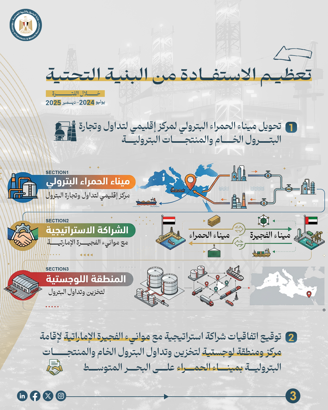 توقيع اتفاقيات تطوير ميناء الحمراء البترولي بالعلمين الجديدة وتحويله لمركز إقليمي علي ساحل البحر المتوسط لتخزين وتداول وتجارة البترول الخام والمنتجات البترولية، وذلك بالتعاون مع موانئ الفجيرة الإماراتية التي تعد ثاني أكبر مركز عالميا في هذا المجال.