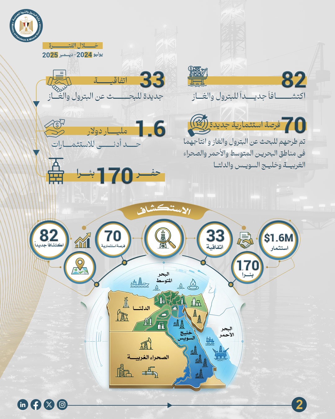تم توقيع 33 اتفاقية جديدة للبحث عن البترول والغاز وانتاجهما باستثمارات حدها الأدنى يزيد عن 1.6 مليار دولار وحفر أكثر من 170 بئرًا جديدة.