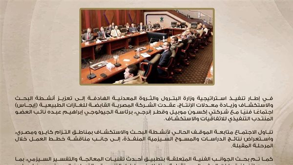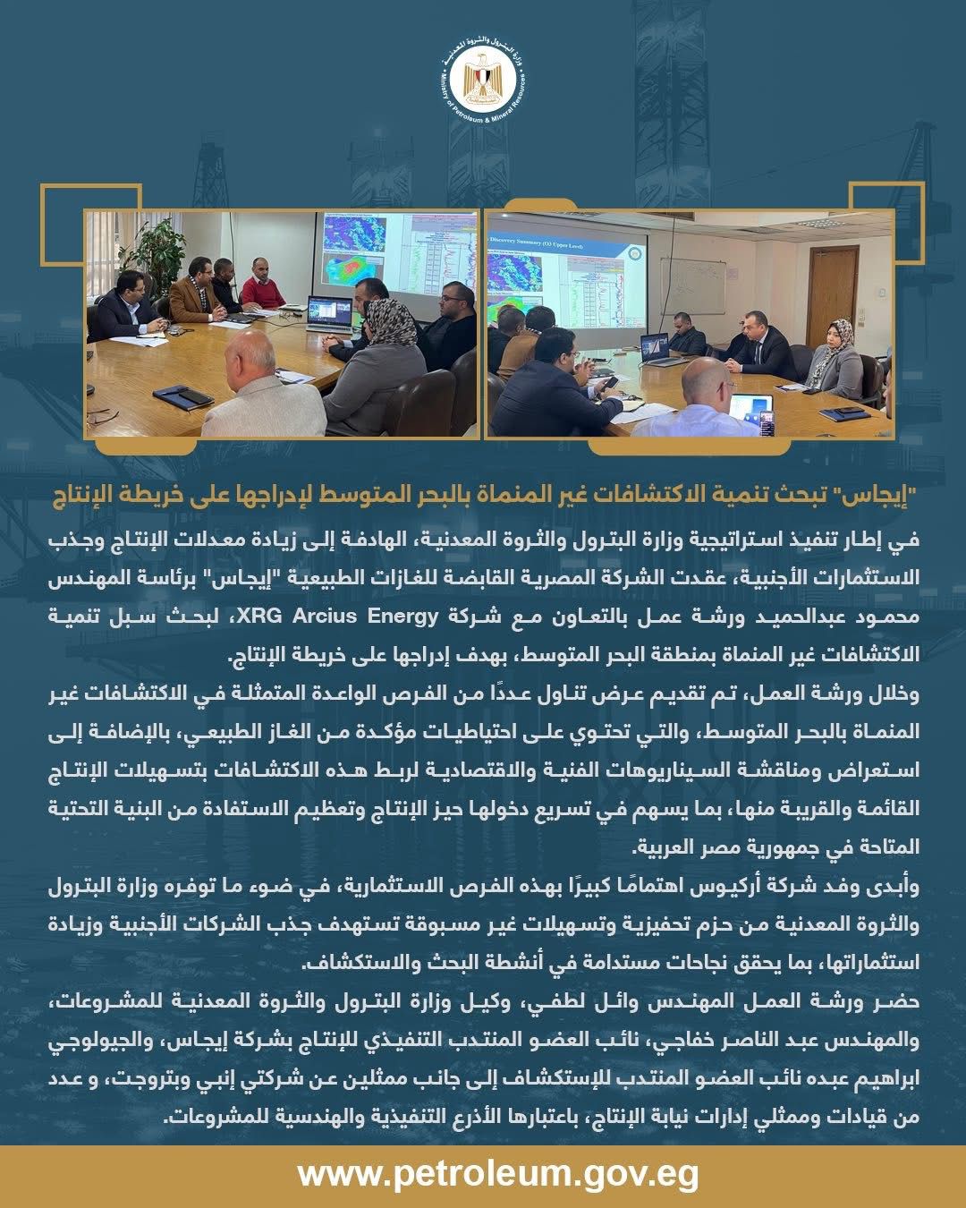 في إطار تنفيذ استراتيجية وزارة البترول والثروة المعدنية، الهادفة إلى زيادة معدلات الإنتاج وجذب الاستثمارات الأجنبية، عقدت الشركة المصرية القابضة للغازات الطبيعية "إيجاس" برئاسة المهندس محمود عبدالحميد ورشة عمل بالتعاون مع شركة XRG Arcius Energy، لبحث سبل تنمية الاكتشافات غير المنماة بمنطقة البحر المتوسط، بهدف إدراجها على خريطة الإنتاج.