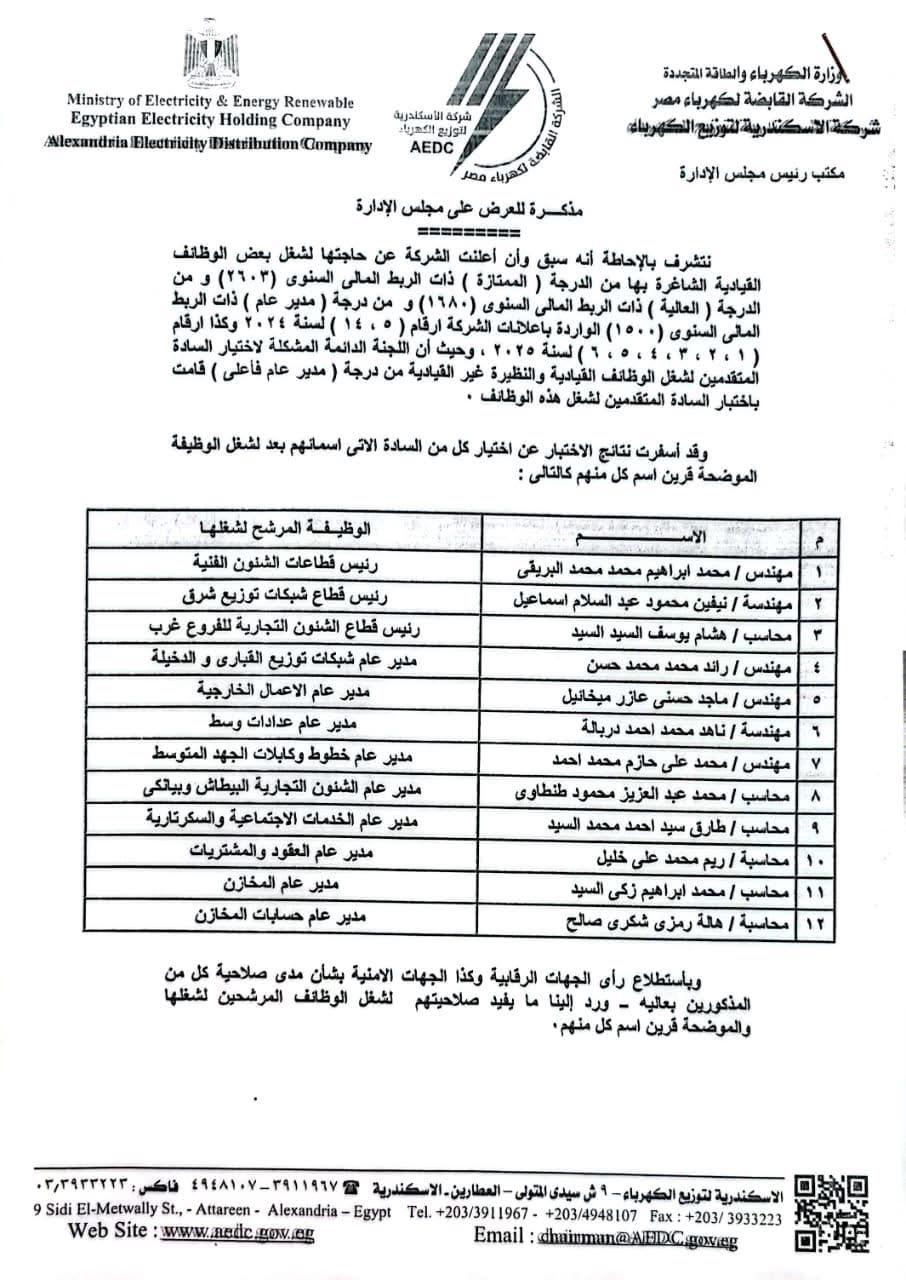 اعتمدت شركة الإسكندرية لتوزيع الكهرباء أكبر حركة ترقيات وتنقلات وظيفية بمختلف قطاعات الشركة، في إطار جهودها المستمرة لتعزيز كفاءة الأداء، ودعم القيادات الشابة، وتجديد الدماء بالمناصب القيادية، بما يواكب متطلبات التطوير المؤسسي وتحسين جودة الخدمات المقدمة للمواطنين.
