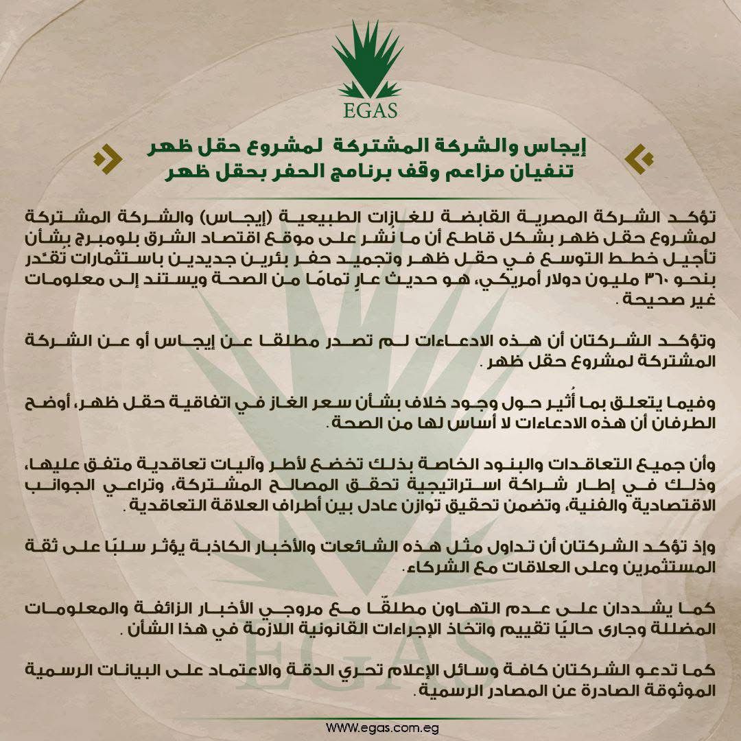 وأوضحت الشركتان أن ما نُشر حول تجميد حفر بئرين جديدين باستثمارات تُقدَّر بنحو 300 مليون دولار، لا أساس له من الصحة، ولم يصدر مطلقًا عن إيجاس أو أي من الشركاء القائمين على مشروع حقل ظهر.