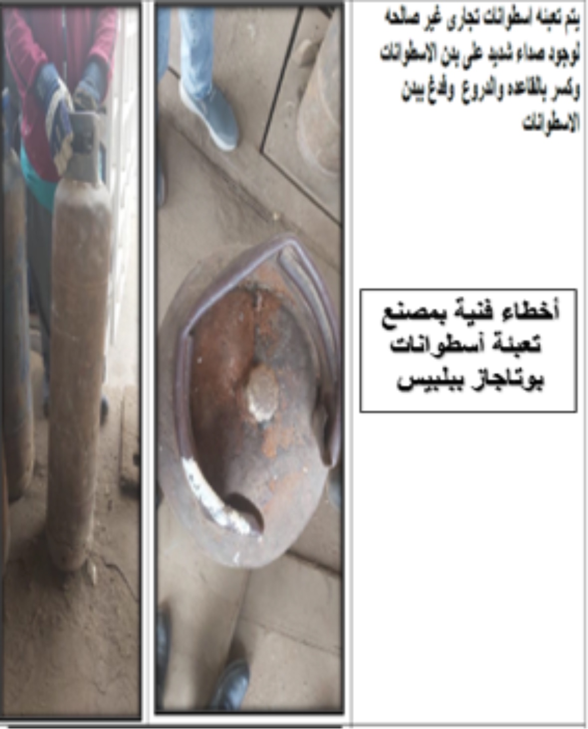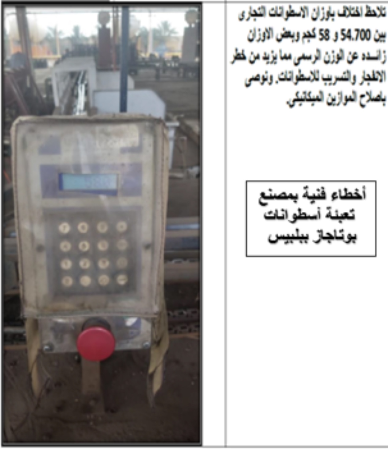 إجراء مراجعة على مصنع بوتاجاز في بلبيس بمحافظة الشرقية، وتم رصد تعطل الموازين، ما نتج عنه نقص وزيادات عن الأوزان المسموح بها بما يمثل خطورة، إلى جانب تعبئة أسطوانات تجاري غير صالحة للتداول .