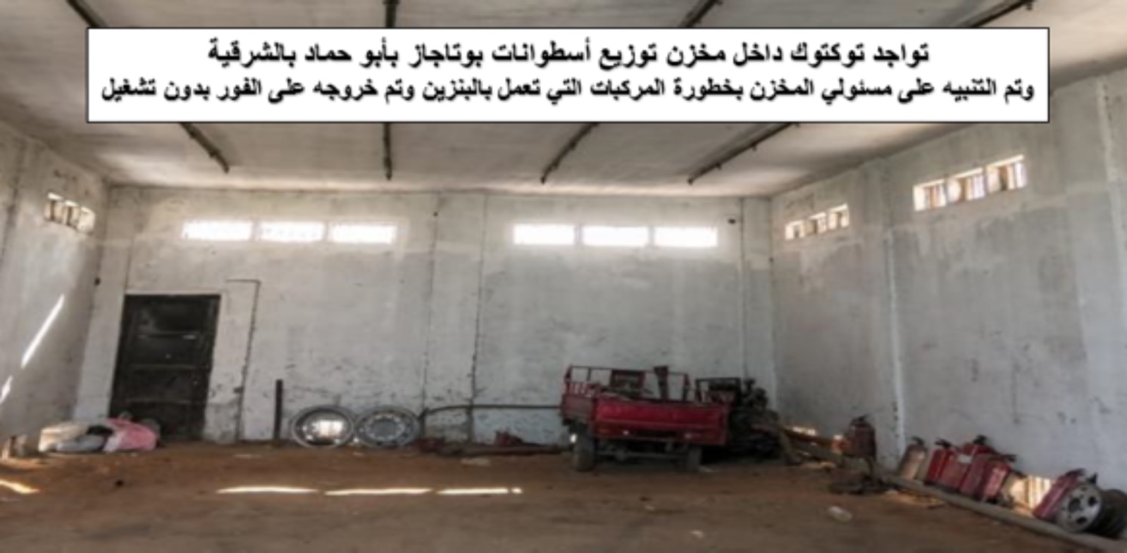 تم المرور على مخزن لتوزيع الأسطوانات بمركز أبو حماد بالشرقية، وتم رصد أخطاء تصميمية بمنظومة الإطفاء، والتنبيه بسرعة تعديلها، و التوعية بخطورة وجود مركبات تعمل بالبنزين داخل المخزن.